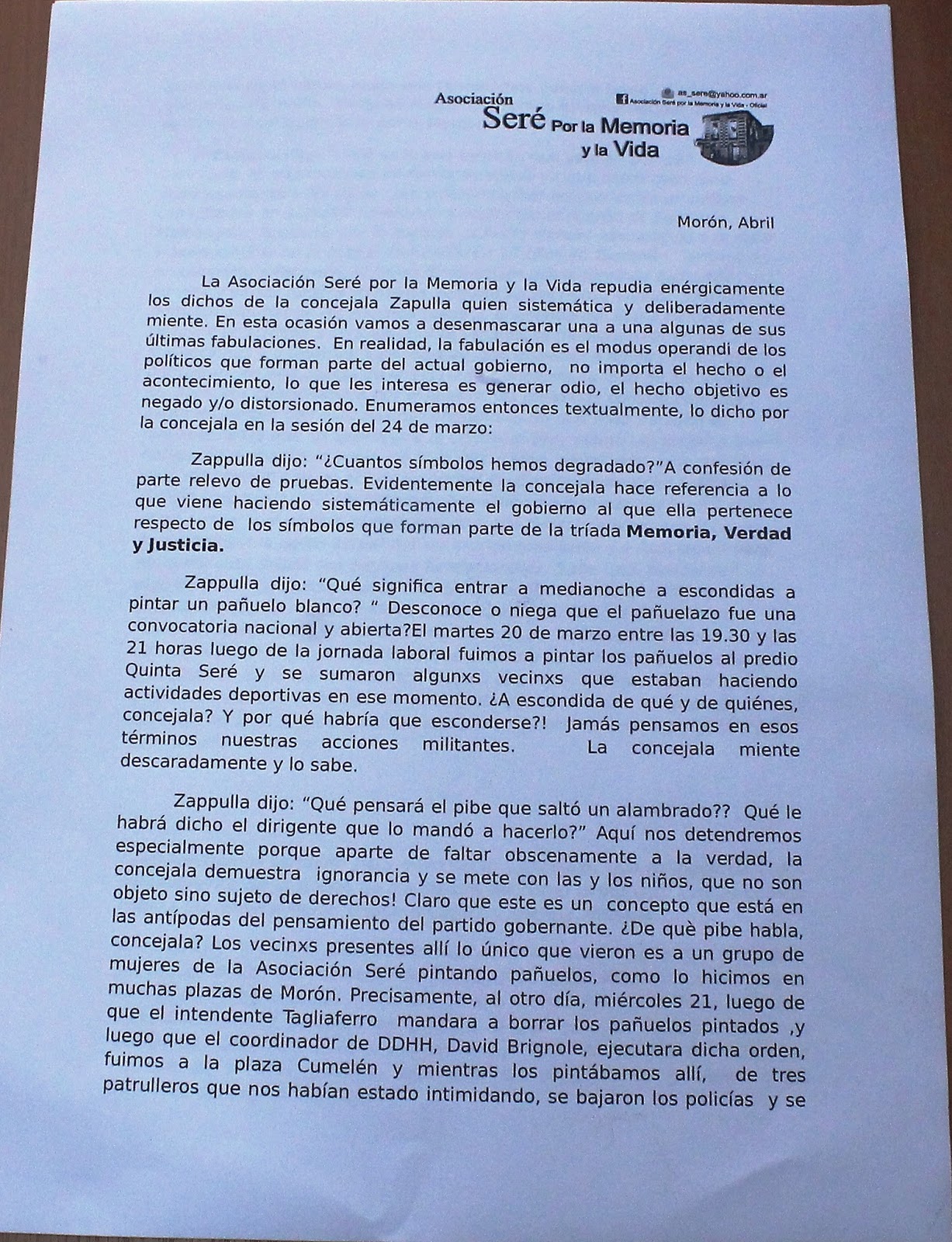 «La Asociación Seré por la Memoria y la Vida repudia enérgicamente los dichos de la concejala Zapulla quien sistemática y deliberadamente miente. En esta ocasión vamos a desenmascarar una a una algunas de sus últimas fabulaciones. En realidad, la fabulación es el modus operandi de los políticos que forman parte del actual gobierno, no importa el hecho o el acontecimiento, lo que les interesa es generar odio, el hecho objetivo es negado y/o distorsionado. Enumeramos entonces textualmente, lo dicho por la concejala en la sesión del 24 de marzo: