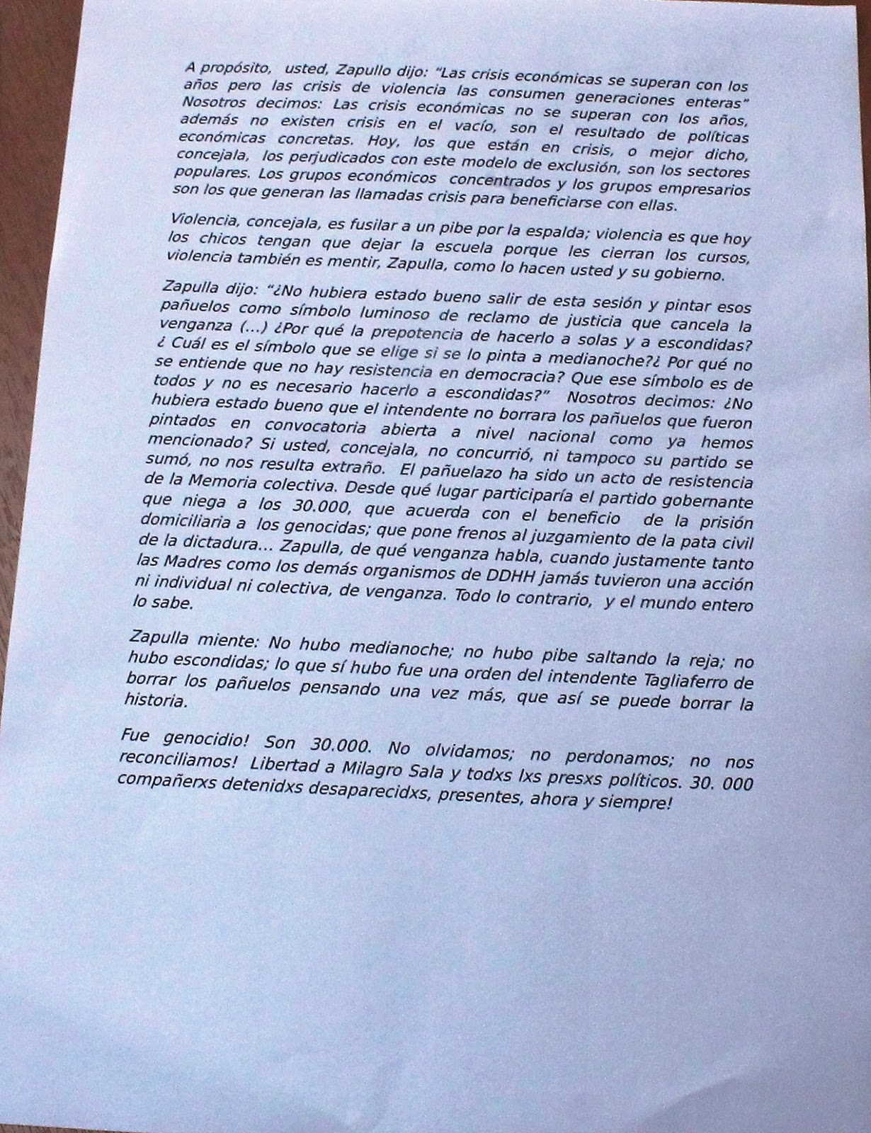 Zapulla dijo: “¿No hubiera estado bueno salir de esta sesión y pintar esos pañuelos como símbolo luminoso de reclamo de justicia que cancela la venganza (…) ¿Por qué la prepotencia de hacerlo a solas y a escondidas?¿ Cuál es el símbolo que se elige si se lo pinta a medianoche?¿ Por qué no se entiende que no hay resistencia en democracia? Que ese símbolo es de todos y no es necesario hacerlo a escondidas?” Nosotros decimos: ¿No hubiera estado bueno que el intendente no borrara los pañuelos que fueron pintados en convocatoria abierta a nivel nacional como ya hemos mencionado? Si usted, concejala, no concurrió, ni tampoco su partido se sumó, no nos resulta extraño. El pañuelazo ha sido un acto de resistencia de la Memoria colectiva. Desde qué lugar participaría el partido gobernante que niega a los 30.000, que acuerda con el beneficio de la prisión domiciliaria a los genocidas; que pone frenos al juzgamiento de la pata civil de la dictadura…