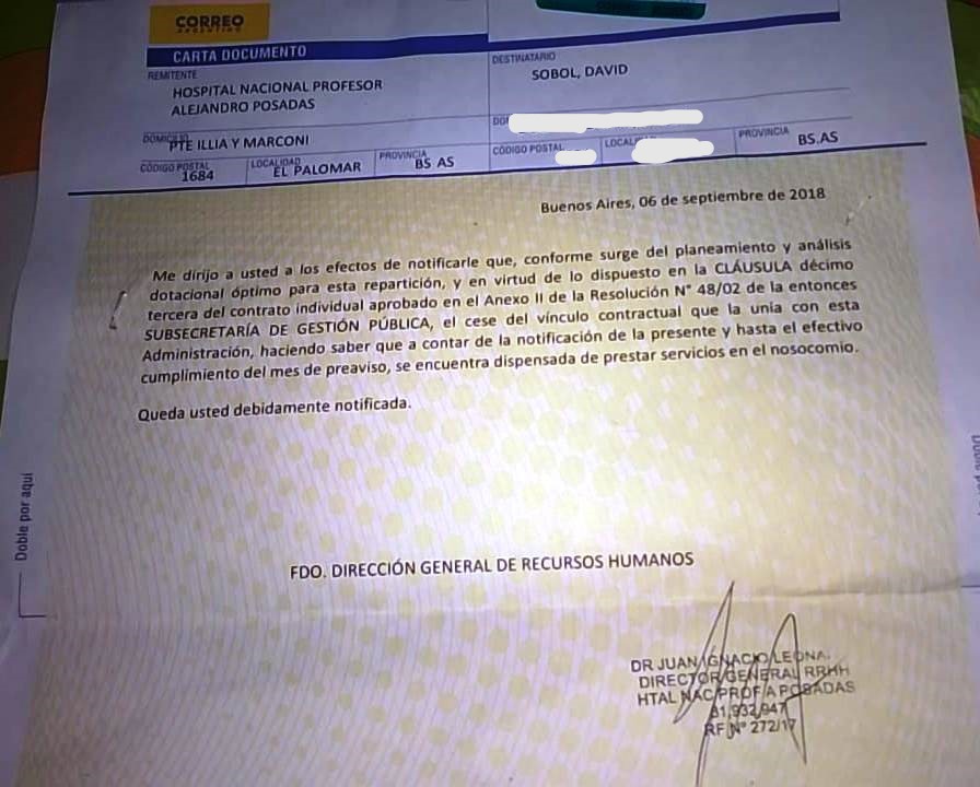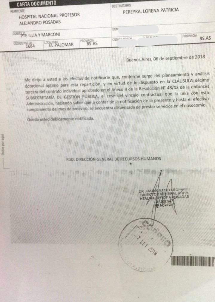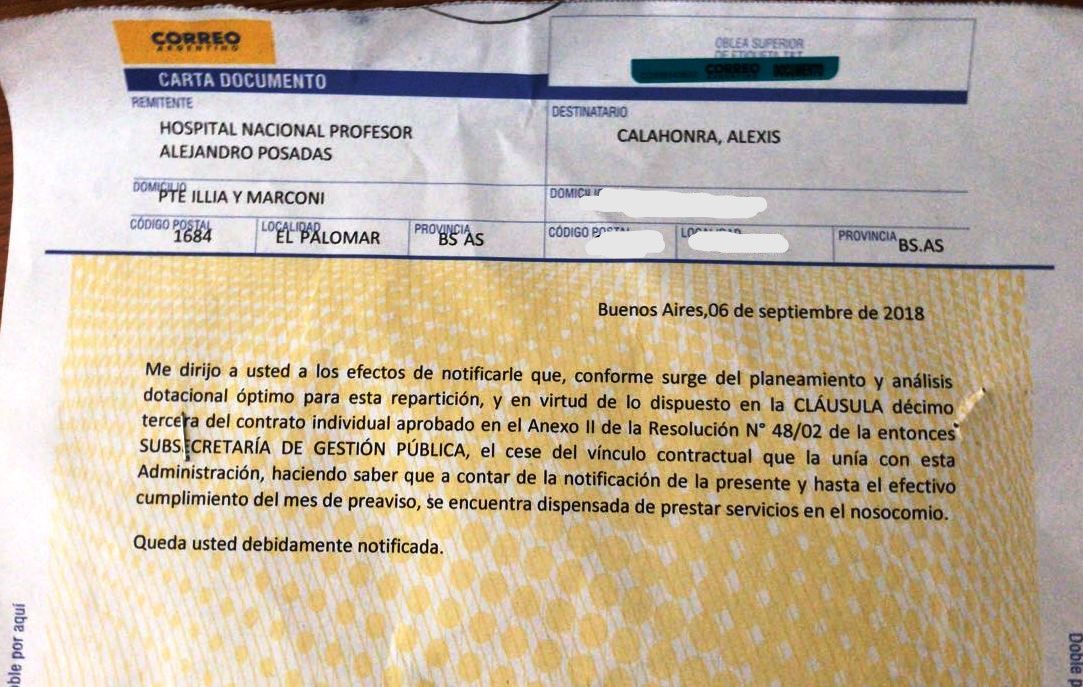 Del Río había sido notificado hace menos de un mes de que había incurrido en «causal de cesantía» por supuestas faltas injustificadas a su servicio: imputación que él negó rotundamente (ver: «Continúan los Despidos y Persecución a los Sindicatos…»). Sin embargo (en una decisión acorde al cariz persecutorio y claramente vaciador de la dirección del Posadas), con fecha 5 de setiembre, Del Río recibió una carta documento (6 días más tarde) donde se le informaba que quedaba cesanteado de su «función asistente de alimentación hospitalaria… por haber incurrido en causal» de despido. Es decir, por haber faltado a su trabajo, aunque él y varios testigos aseguran que eso no es cierto, y dejan en evidencia una alevosa persecución gremial.