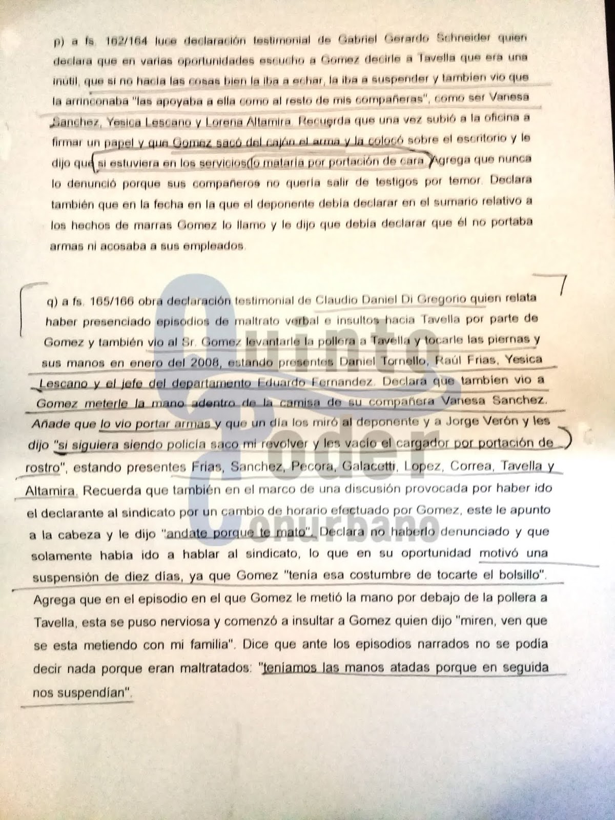 Entre las fs. 139 a 166 los testigos contra Gómez como Aurelio Pecora, Jorge Verón, Daniel González, Raúl Farías, Vanesa Sánchez, Claudio Di Gregorio y Marcelo Rodríguez, testificaron que existió maltrato psicológico, verbal, acoso y abuso sexuales, no sólo contra Tavella, sino contra varias empleadas que incluía tocadas de cola, besos de prepo en la boca, manoseos abusivos en los senos y partes bajas; también aseguraron que las amenazas y descalificaciones verbales incluían frases como “mogólica, inútil”, “negrito de mierda, te echo y te mando a la loma del culo”, “negra yo soy un dios”, “gremialista, vas a terminar como Rucci”, “qué buena que estás ¿Querés el plus?”