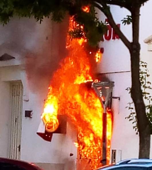 (Morón, 14/11) Bomberos Voluntarios de Morón lograron detener un incendio de gran dimensión en el palacio municipal y que se inició en el cajero automático que el Banco de la Provincia de Buenos Aires posee sobre la calle Brown entre Belgrano y San Martín. El dispenser de dinero quedó totalmente destruido por el siniestro que recién hace minutos pudo ser detenido.