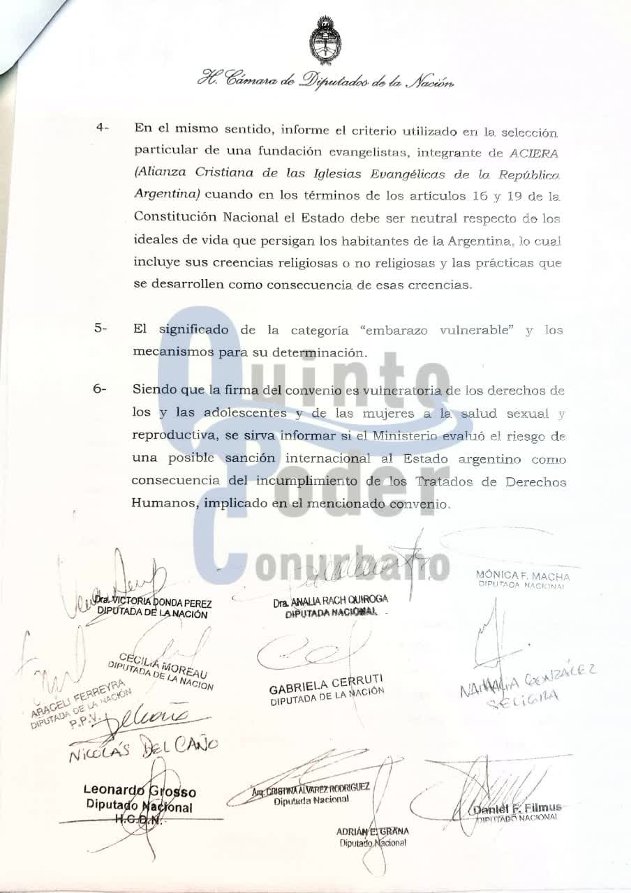 Es que el acto que se llevó a cabo el 6 de marzo pasado llevaba implícito la firma de un millonario convenio entre el «Ministerio de Desarrollo Social de la Nación y la Fundación «Vida en Familia»», de acuerdo a lo que advierte Macha en el proyecto de resolución ingresado el pasado lunes. Es en ese mismo sentido es que indaga también sobre «los mecanismos de selección y licitación utilizados para el otorgamiento de 1.430.000 pesos a dicha organización…» Consultando asimismo con qué criterio se seleccionó una ONG «que públicamente promueve el incumplimiento a la normativa vigente en… materia de derechos sexuales y reproductivos de las mujeres.»
