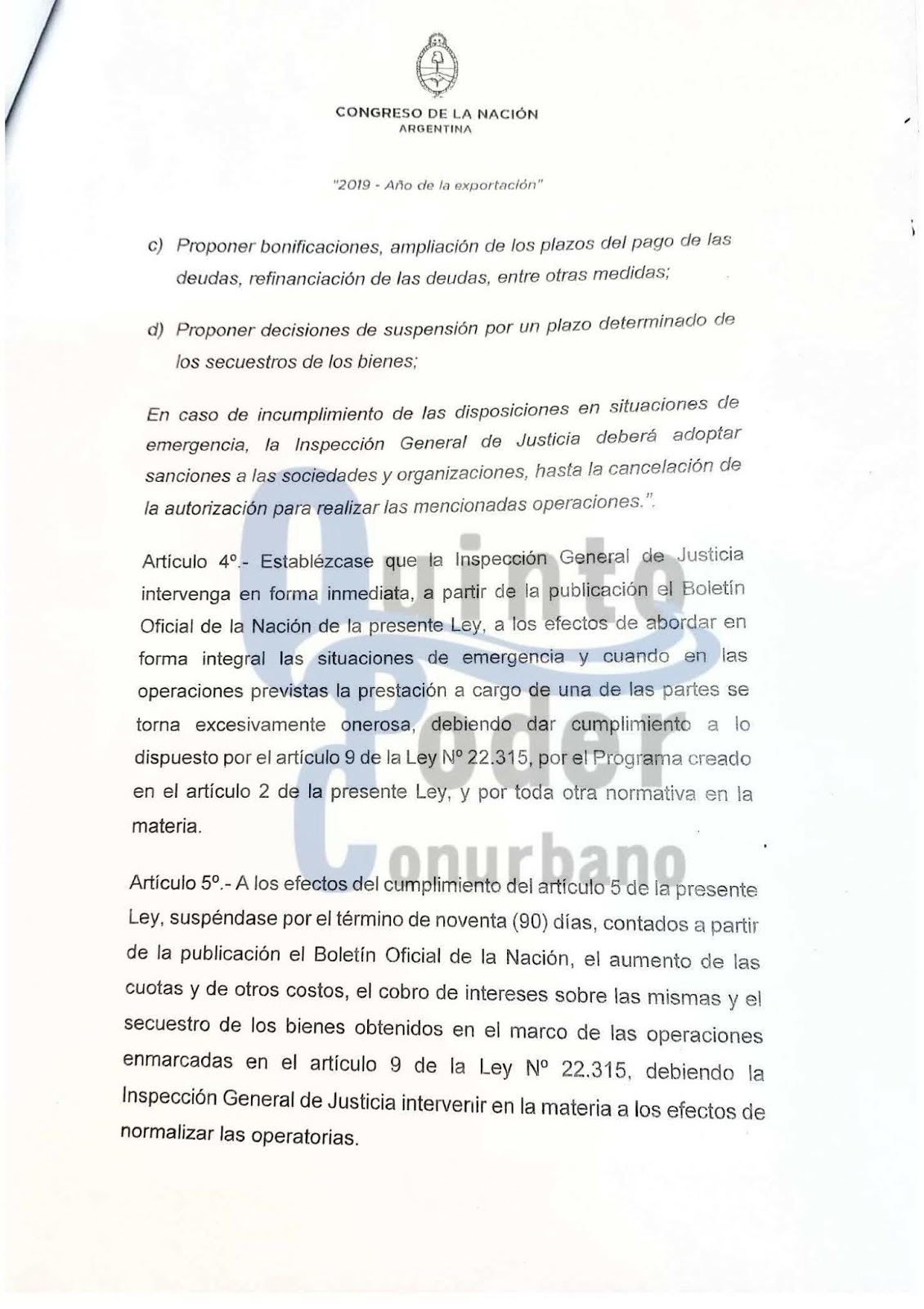 Finalmente, en los artículos 4, 5 y 6 del proyecto normativo en cuestión se prevé: la intervención inmediata de la Inspección General de Justicia una vez dada a publicidad la pretendida ley en el Boletín Oficial de la Nación para «abordar en forma integral las situaciones de emergencia»; la suspensión «por el término de noventa (90) días, contados a partir de la publicación el Boletín Oficial de la Nación, del aumento de las cuotas y de otros costos, el cobro de intereses sobre las mismas y el secuestro de los bienes obtenidos en el marco de las operaciones enmarcadas en el artículo 9 de la Ley Nº 22.315, debiendo la Inspección General de Justicia intervenir en la materia a los efectos de normalizar las operatorias» y un plazo de noventa días para que el departamento ejecutivo presente un proyecto de ley que reemplace el decreto que actualmente rige en la materia «estableciendo un sistema… que garantice condiciones de equidad, transparencia y trato justo y digno.»