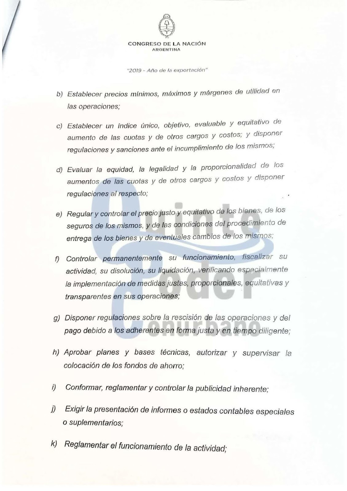 Es así que el proyecto en cuestión prevé la creación «en el ámbito del Poder Ejecutivo Nacional de un Programa Nacional de Regulación de las operaciones» de ahorro englobadas en la Ley Orgánica de la Inspección General de Justicia y, desde allí, «crear un Registro de Adherentes de las operaciones enmarcadas en el artículo 9» de dicha ley, «evaluando su situación social, económica y financiera y su situación frente al contrato de adhesión y a las sociedades administradoras de las operaciones; disponer medidas de asesoramiento y protección de los adherentes a estas operaciones ante situaciones de abusos; verificar que la Inspección General de Justicia cumpla diligente y debidamente sus funciones de regulación, contralor y sanción en la materia y notificar casos de incumplimientos a la Jefatura de Gabinete de Ministros de la Nación y al Ministerio de Justicia y Derechos Humanos de la Nación; promover deducciones impositivas y de otros costos que faciliten la producción, la comercialización, el pago y el acceso a los bienes de producción nacional que se busquen adquirir mediante las modalidades previstas en el artículo 9 de la Ley Nº 22.315; promover líneas de créditos con tasas de intereses subsidiadas que faciliten la producción, la comercialización, el pago y el acceso a los bienes de producción nacional que se busquen adquirir mediante las modalidades previstas en el artículo 9 de la Ley Nº 22.315; (y) articular acciones con las Defensorías del Pueblo, la Secretaría de Comercio Interior, otras organizaciones gubernamentales y no gubernamentales vinculadas a los derechos de los usuarios y consumidores, y con otros organismos públicos vinculados a la materia»