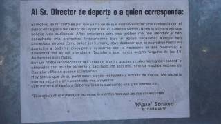 Previamente, por ese mismo medio, había dirigido una carta abierta al «Director de deporte…», donde manifiesta: «No es la primera vez que solicitó una audiencia. Años anteriores con otra gestión me han atendido y han escuchado mis proyectos, brindándome todo el apoyo necesario…» Y remató: «Hoy siento que de su parte estoy siendo rechazado», aclarando que: «Esto no toca a la señora gobernadora a la cual siento una gran admiración.»