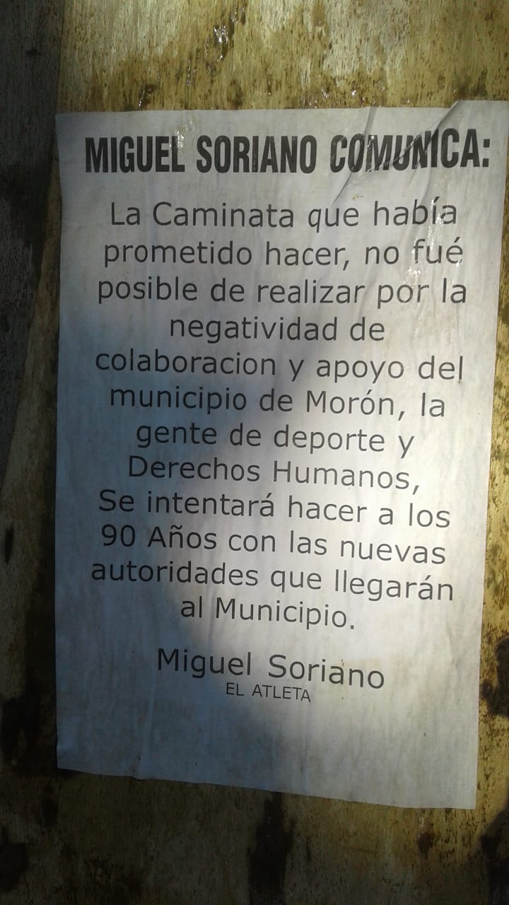 Cansado de los destratos de le versión macrista moronense, Soriano se dirigió al intendente y al responsable de deportes municipal públicamente por medio de afiches caseros pegados en las inmediaciones del Polideportivo Gorki Grana: «La caminata que había prometido hacer, no fue posible realizar por la negatividad de colaboración y apoyo del municipio de Morón»; explica en uno de los carteles. Y agrega sugestivamente: «Se intentará hacer a los 90 años con las nuevas autoridades que llegarán al municipio.«