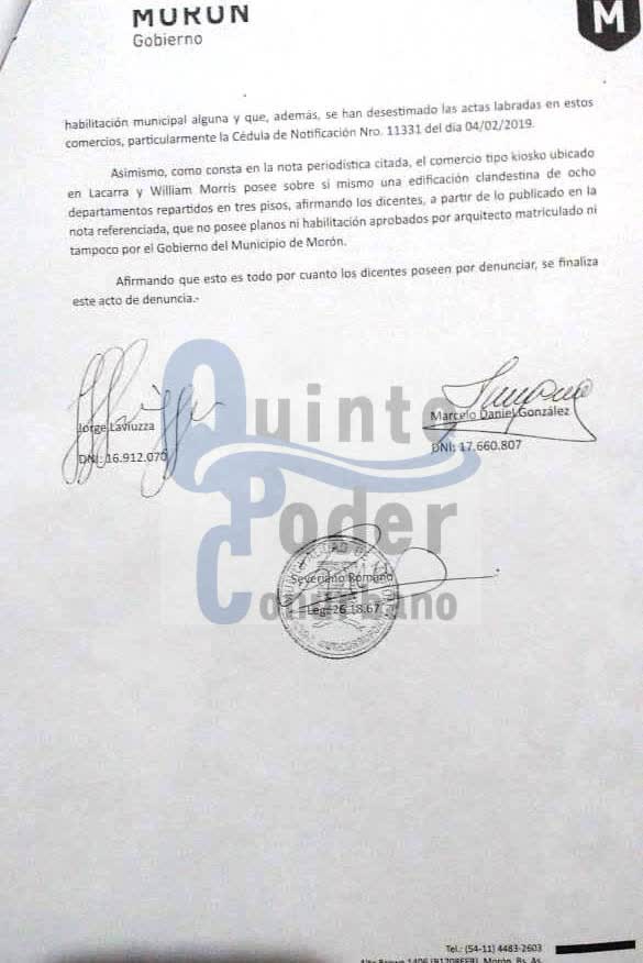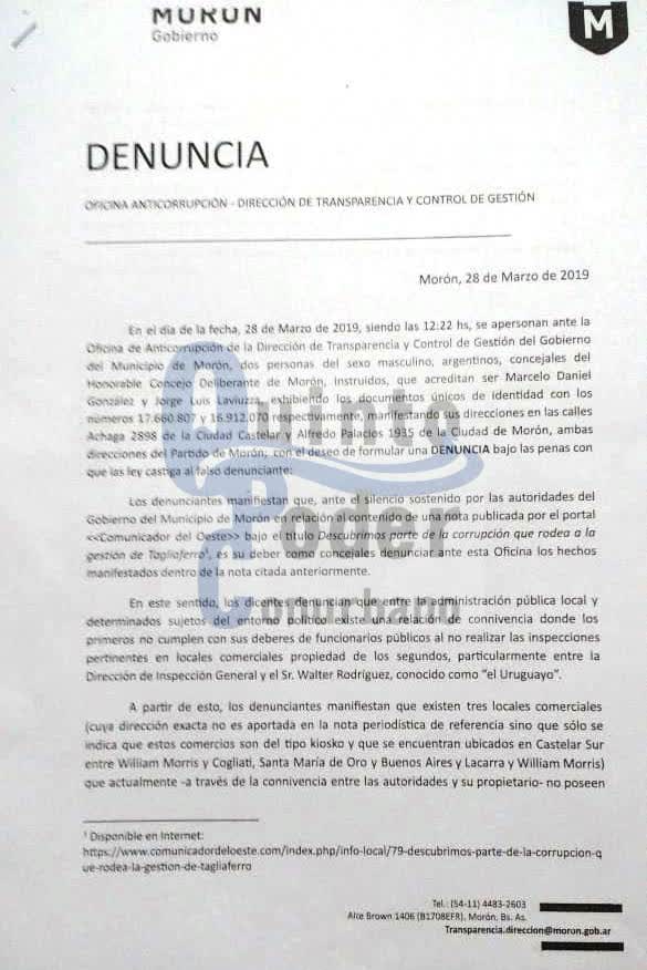 En la denuncia, fechada 28 de marzo, los ediles manifiestan que «ante el silencio sostenido por las autoridades del Gobierno del Municipio de Morón… es su deber como concejales denunciar… los hechos manifestados dentro de la nota…» Y, párrafo seguido, la denuncia agrega: «entre la administración pública local y determinados sujetos del entorno político existe una relación de connivencia donde los primeros no cumplen sus deberes de funcionarios públicos al no realizar las inspecciones pertinentes en locales comerciales propiedad de los segundos…»