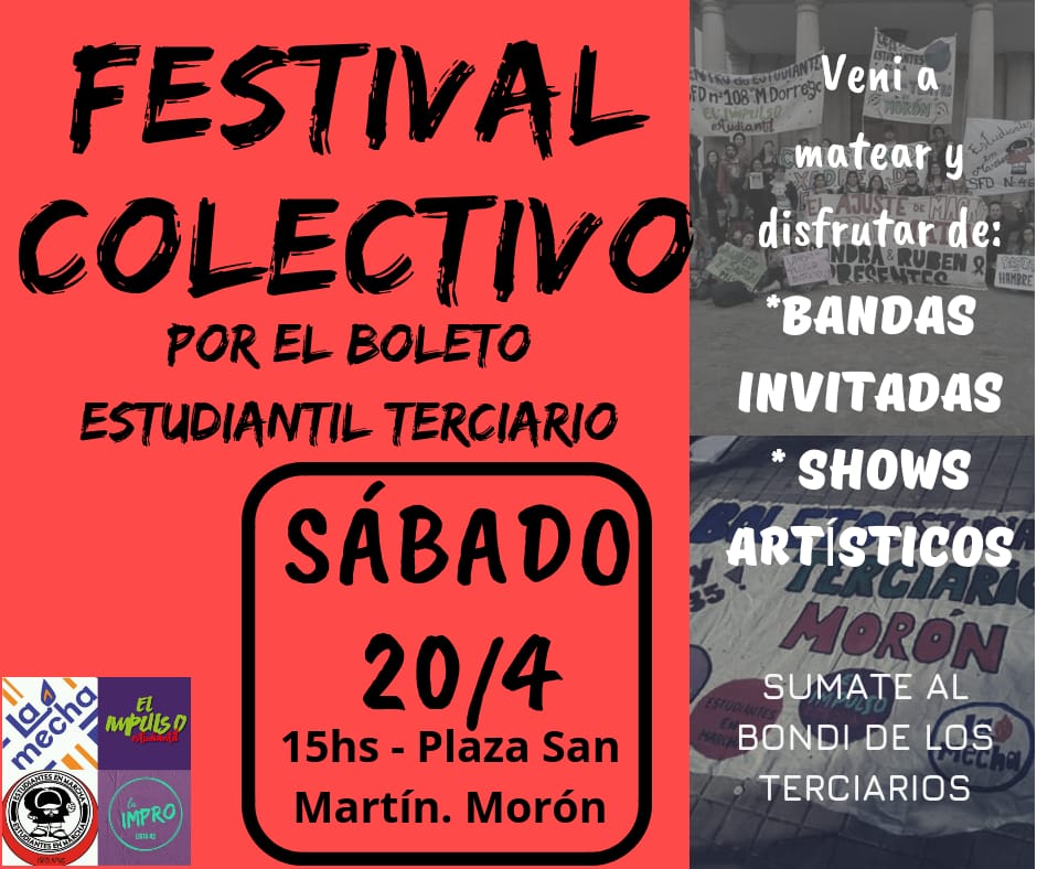 (Morón) En el marco de los reclamos que vienen llevando a cabo los Institutos de Formación Terciaria de este distrito, en materia de infraestructura, currícula y beneficios para los estudiantes de esos institutos, este sábado 20 de abril se realizará en la Plaza San Marín de Morón un «Festival Colectivo por el boleto estudiantil» organizado por los Centros de Estudiantes de los Institutos de Formación Docente 45 y 108 (Manuel Dorrego), del Conservatorio Alberto Ginastera y de la Escuela de Teatro Municipal.