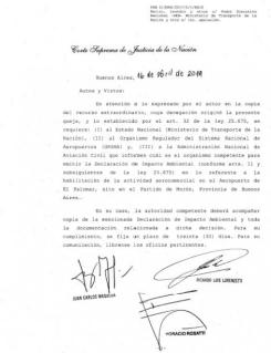 Sin embargo, cuatro días más tarde la Corte Suprema de justicia, aguó la fiesta macrista al requerir al «Estado Nacional (Ministerio de Transporte de la Nación), al Organismo Regulador del Sistema Nacional de Aeropuertos (ORSNA), y a la Administración Nacional de Aviación Civil que informen cuál es el organismo competente para emitir la declaración de impacto ambiental… en lo referente a la habilitación de la actividad aerocomercial en el Aeropuerto de El Palomar…»