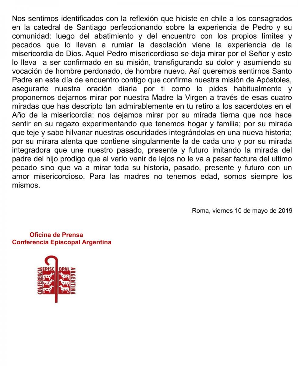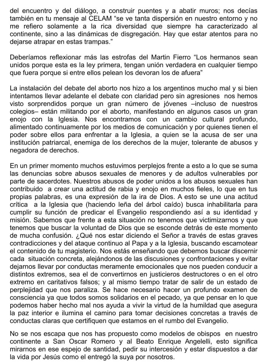 Y párrafo seguido manifiestan: «En un primer momento muchos estuvimos perplejos frente a esto a lo que se suma las denuncias sobre abusos sexuales de menores y de adultos vulnerables por parte de sacerdotes. Nuestros abusos de poder unidos a los abusos sexuales han contribuido a crear una actitud de rabia y enojo en muchos fieles, lo que en tus propias palabras, es una expresión de la ira de Dios. A esto se une una actitud crítica a la Iglesia que (haciendo leña del árbol caído) busca inhabilitarla para cumplir su función de predicar el Evangelio respondiendo así a su identidad y misión. Sabemos que frente a esta situación no tenemos que victimizarnos y que tenemos que buscar la voluntad de Dios que se esconde detrás de este momento de mucha confusión.»