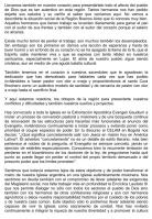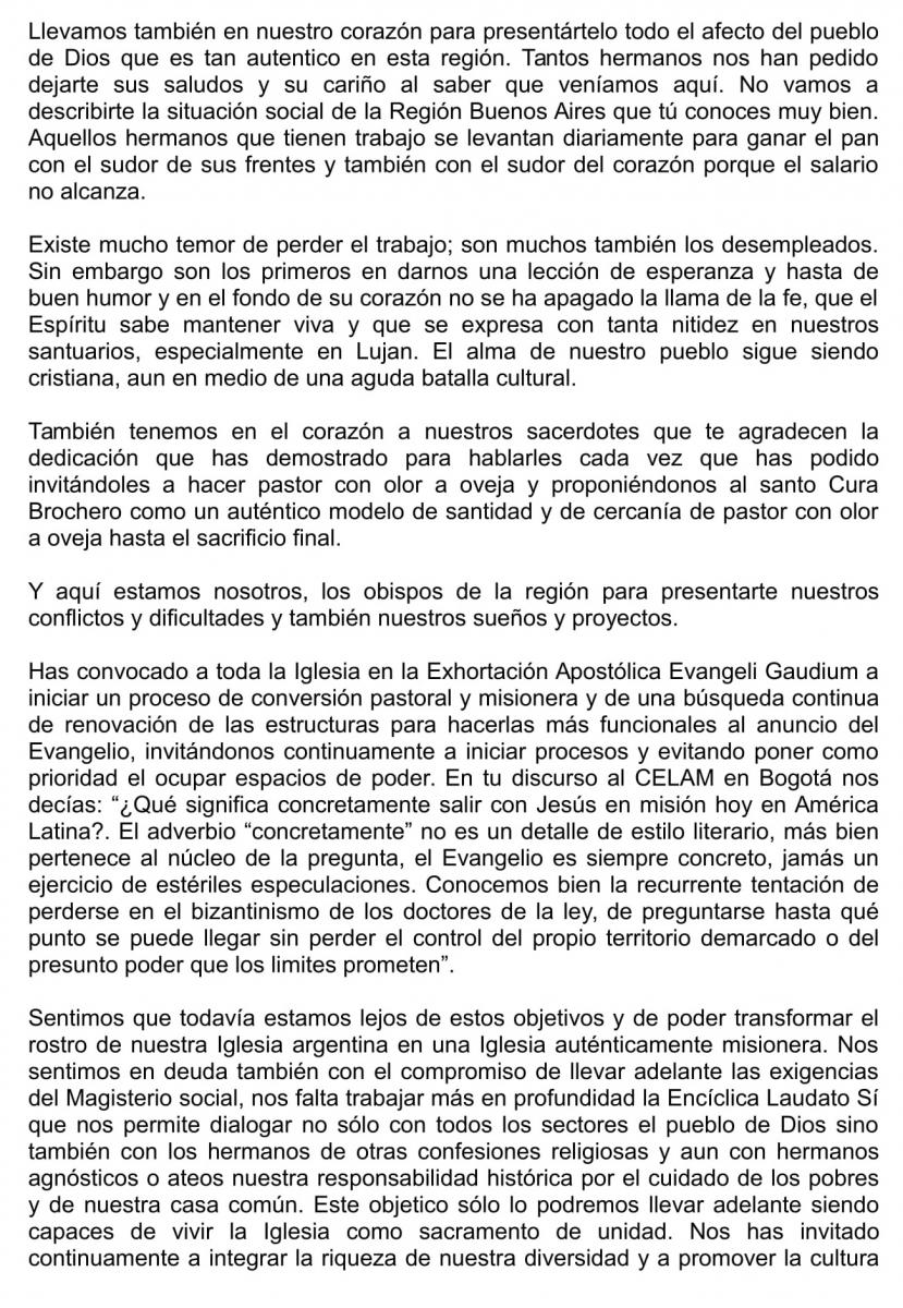 «Nos parece que nos falta mucho camino que recorrer para estar a la altura de nuestra responsabilidad de ser una Conferencia Episcopal de la que tú fueras un miembro calificado. La Conferencia Episcopal de tu patria»; reflexionan los obispos. Y en referencia a la crisis económico-social de esta región manifiestan:«No vamos a describirte la situación social de la Región Buenos Aires que tú conoces muy bien. Aquellos hermanos que tienen trabajo se levantan diariamente para ganar el pan con el sudor de sus frentes y también con el sudor del corazón porque el salario no alcanza. / Existe mucho temor de perder el trabajo; son muchos también los desempleados. Sin embargo son los primeros en darnos una lección de esperanza y hasta de buen humor y en el fondo de su corazón no se ha apagado la llama de la fe…»