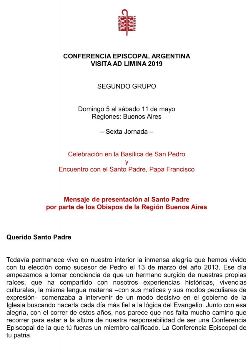 (Ciudad del Vaticano, 5 a 11/05) Del 28 de abril al 19 de mayo, los obispos argentinos visitan al Papa Francisco, en lo que se denomina en términos eclesiásticos «Visita Ad Limina» y que no es otra cosa que la visita periódica que los obispos católicos de todo el mundo deben realizar a la Santa Sede para reunirse con la máxima autoridad de la Iglesia para presentar informes sobre las diócesis que dirigen.