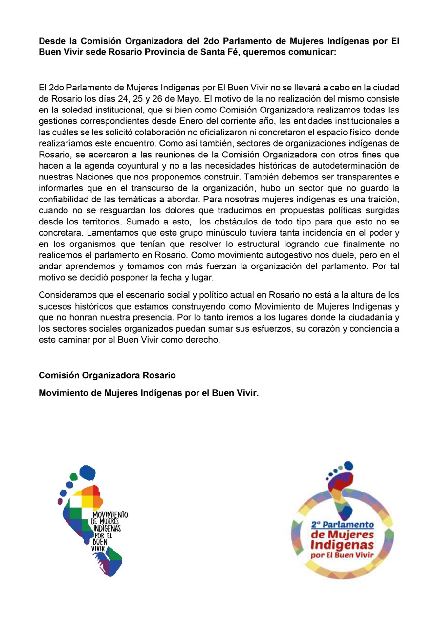 En el documento difundido por las redes sociales, las organizadoras del parlamento explicaron «las entidades institucionales a las cuales se les solicitó colaboración no oficializaron ni concretaron el espacio físico donde realizaríamos el encuentro». Y agregaron que «sectores de organizaciones indígenas de Rosario, se acercaron a las reuniones de la Comisión Organizadora con otros fines que hacen a la agenda coyuntural y no a las necesidades históricas de autodeterminación de nuestras Naciones…»