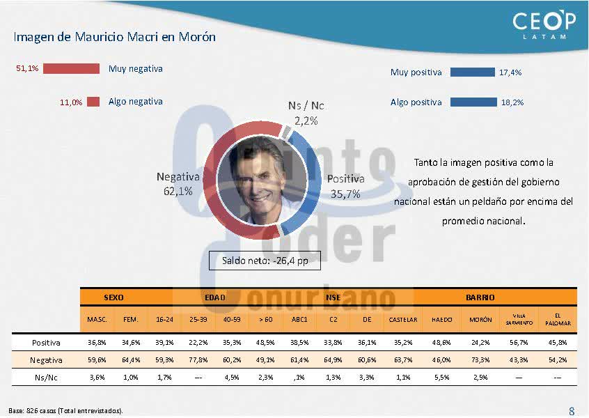 La imagen que los moronenses tienen del presidente Mauricio Macri es una de las peores que puede tener un dirigente político. El 62, 1 % tiene una imagen negativa del Jefe de Estado y el 35, 7 % positiva. La ex presidenta mejoró notoriamente la evaluación que se tiene de ella y descendió las opiniones negativas al 55, 7 % y elevó su positiva al 42, 8 %. El intendente Ramiro Tagliaferro también tiene un diferencial negativo: El 43, 6 % opina mal de él contra el 42, 9 % que opina bien, pero el 13, 5 % no puede omitir opinión porque no lo conoce.