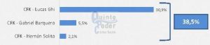 Dentro de las PASO de Unidad Ciudadana (unicas que se realizarían hasta el momento) Lucas Ghi está obteniendo un 30, 9 % del total, seguido por Gabriel Barquero con el 5, 5 % y Hernán Solito con el 2, 1 %. El estudio también revela que el 53, 4 % de los moronenses, a la hora de votar, priorizará la situación económica, el 26, 6 % lo hará pensando en la lucha contra la corrupción y el 20 % en el combate a la inseguridad.