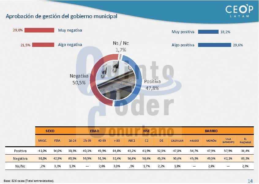 Y cuando se les pregunta a los entrevistados por las preocupaciones de los moronenses, los cuatro puntos más importantes son el estado de las calles (22, 3 %), la inseguridad (21, 3 %), el valor de las tasas e impuestos municipales (14, 1 %) y la corrupción municipal (10, 2 %).