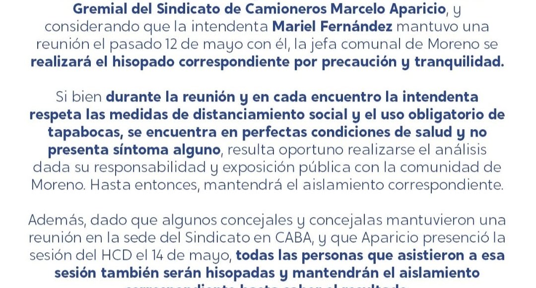 El Honorable Concejo Deliberante (HCD) de Moreno dispuso hoy el aislamiento obligatorio para todos sus integrantes y los empleados que estuvieron presentes en la sesión del pasado 14 de mayo, a la cual asistió el secretario gremial del sindicato de Camioneros, Marcelo Aparicio, quien dio positivo de coronavirus.