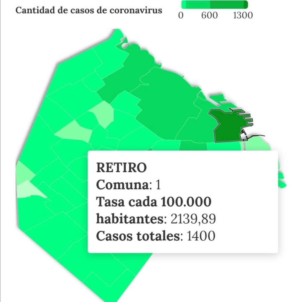 Retiro, con el 34% de los casos, continúa liderando el ránking de barrios con más infectados, seguido por Flores, con el 19% de los diagnósticos de Covid-19, con 480,59 casos cada 100 mil habitantes.