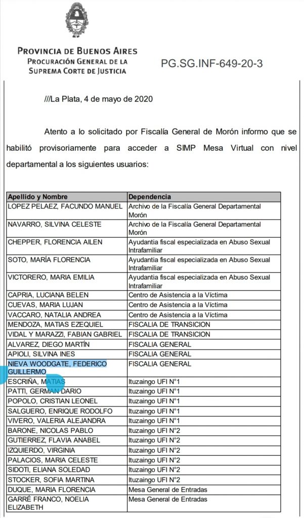 En tercer lugar, y quizá el de mayor gravedad institucional, ya que compromete la seguridad de la Procuración General bonaerense, es que Conte Grand haya avalado y autorizado a Nieva Woodgate a acceder al SIMP (Sistema Informático del Ministerio Público), desde donde se puede acceder a todas las investigaciones que tramitan en el fuero penal de la provincia.