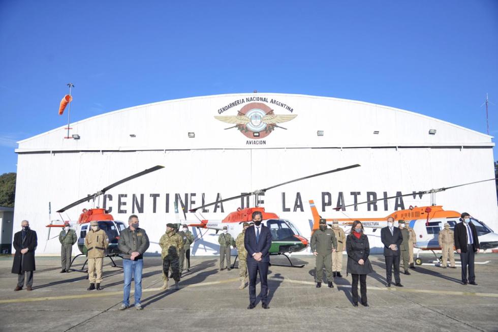 Con la presencia del jefe de Gabinete de Ministros de la Nación, Santiago Cafiero, de la ministra de Seguridad, Sabina Frederic, y de su par de Defensa, Agustín Rossi, se llevó a cabo este viernes por la mañana la entrega por parte de esta última Cartera de tres helicópteros que serán destinados al uso de Fuerzas Federales. Esta entrega se da en el marco del cumplimiento del convenio de transferencia de aeronaves rubricado en 2018.