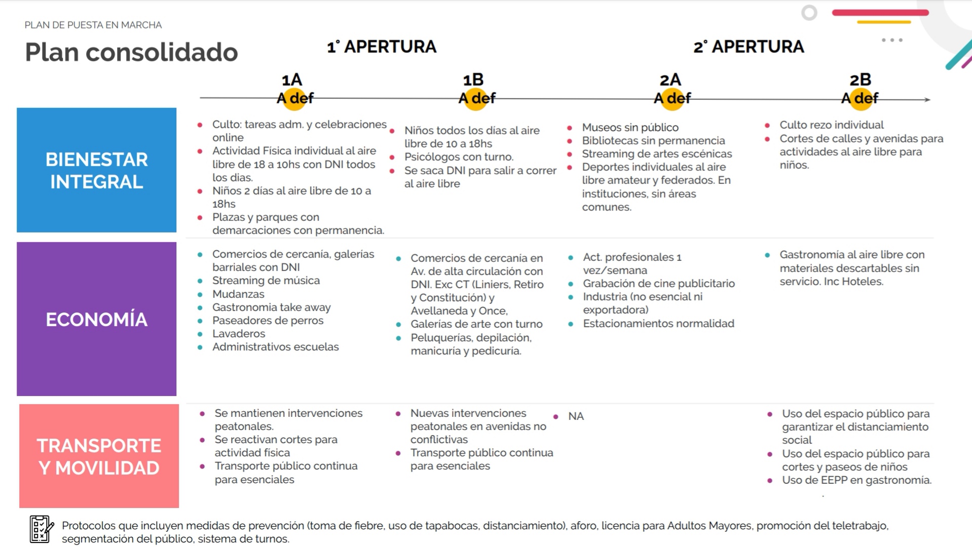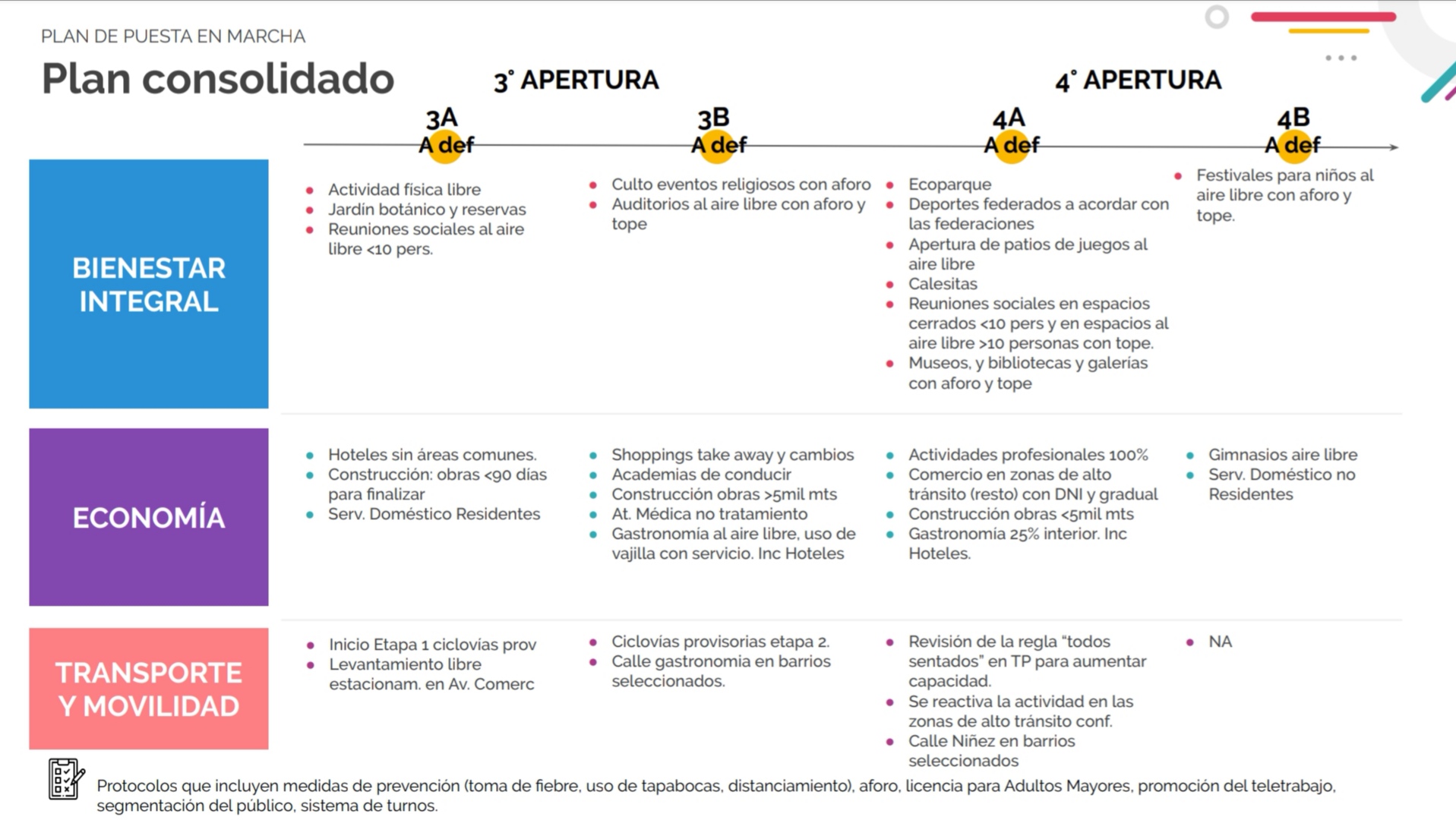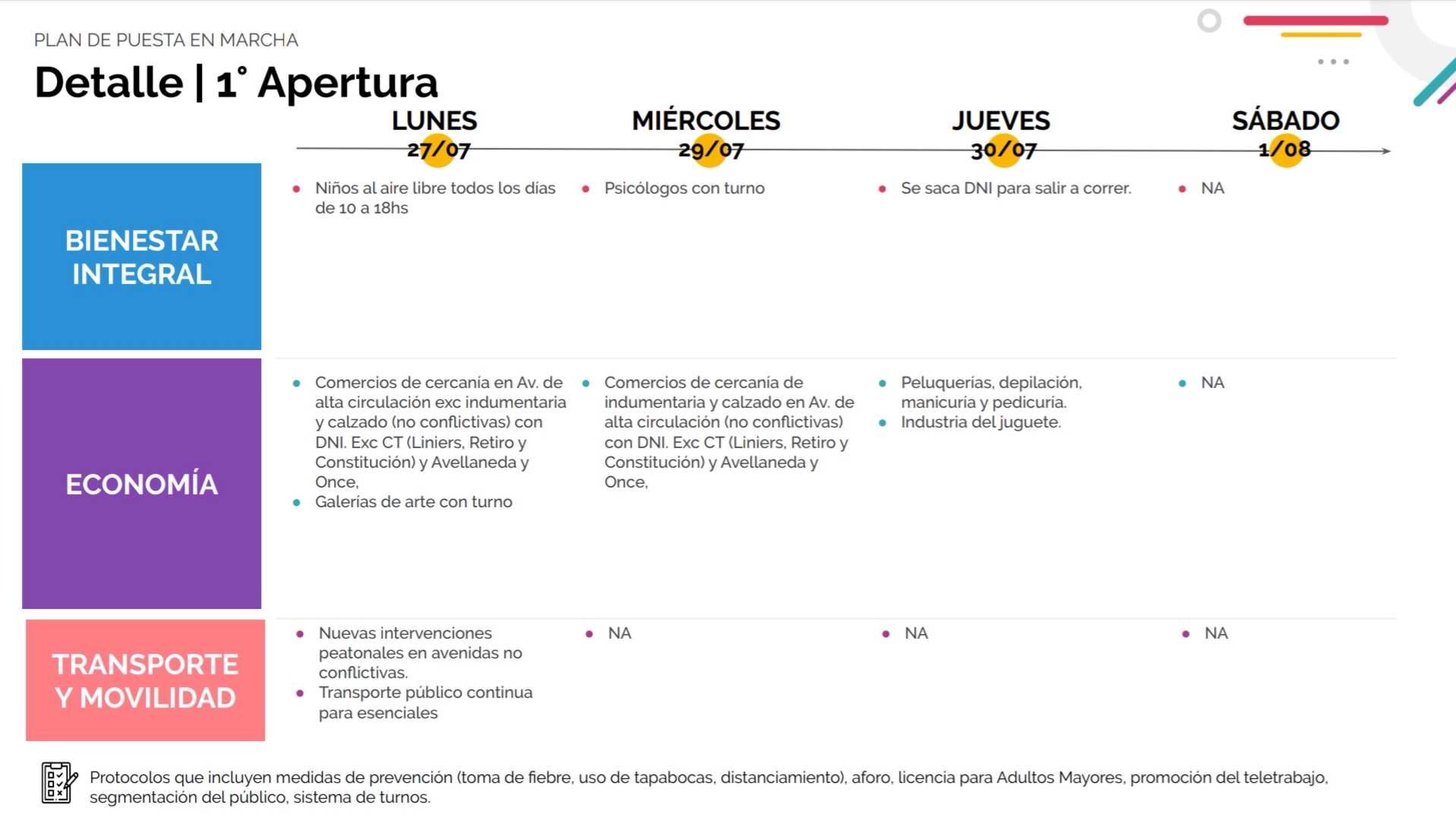 En esta nueva etapa -prevista hasta el 2 de agosto, a menos que cambien las condiciones epidemiológicas- se abrirán en forma gradual en cada distrito comercios e industrias y se habilitarán más paseos con niños, pero se mantendrá el transporte público sólo para trabajadores esenciales. Vale mencionar que en el decreto del Poder Ejecutivo se señala que en los casos de apertura de actividades, cada empleador deberá garantizar el traslado de sus trabajadores.