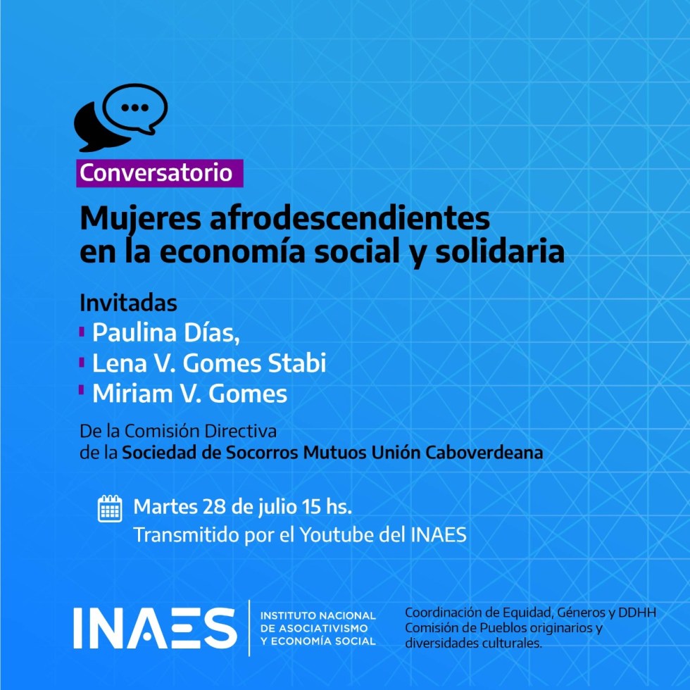 Desde el Instituto Nacional de Asociativismo y Economía Social (INAES), que es el organismo dedicado a la Economia Social y Solidaria, desde la nueva Coordinación de Equidad, Géneros y DDHH a cargo de la Dra. Noemí Marciali, realizarán este próximo martes 28 de Julio 15 horas vía Youtube el «Conversatorio de Mujeres Afrodescendientes en la economía social y solidaria» con la participación de Paulina Días, Lena V. Gomes Stabi y Miriam V. Gomes.