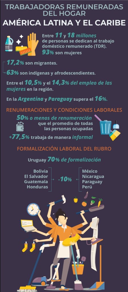 En América Latina y el Caribe, entre 115 y 186 millones de personas se dedican al trabajo doméstico remunerado, de las cuales el 93% son mujeres. El Trabajo doméstico supone en promedio entre el 10,5% y e 14,3% del empleo de las mujeres en la región. En países como Argentina y Paraguay ese porcentaje supera el 16%.