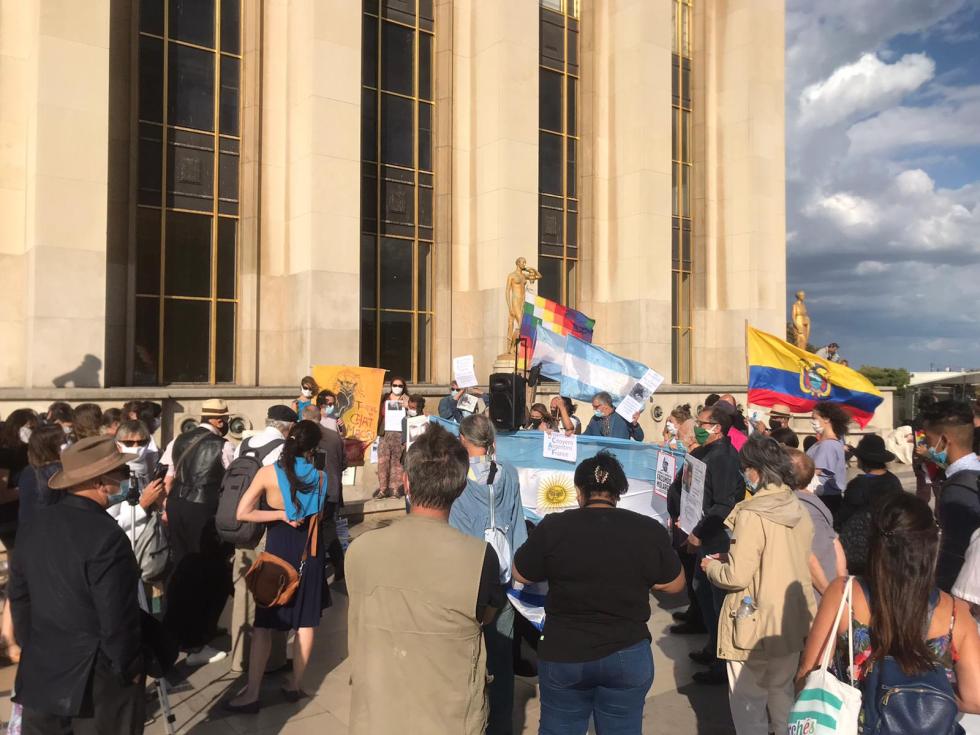 Los argentinos e integrantes de organizaciones de derechos humanos latinoamericanas, ONGs y de fuerzas de izquierda del país galo, como Francia Insumisa (FI), que lidera el ex candidato a presidente Jean-Luc Mélenchon, se concentraron poco después de las 13 de la Argentina (las 18 en París) en la Explanada de los Derechos Humanos, ubicada en Trocadero, uno de los principales puntos turísticos de la capital francesa, para rechazar la presencia de Macri en esa ciudad, en un «momento nacional y mundial de extrema precariedad» por la pandemia de coronavirus.