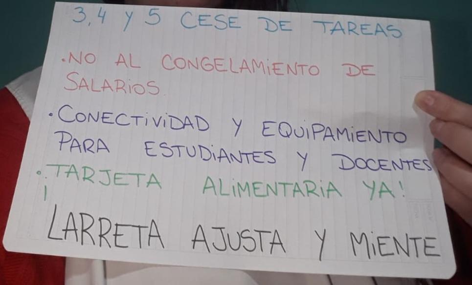 A la lista de reclamos en este cese de tareas, se suma la garantía del acceso a la conectividad para docentes y estudiantes, lo cual resulta del todo significativo en esta época de pandemia, en la cual la única forma de garantizar la continuidad pedagógica es de manera virtual.