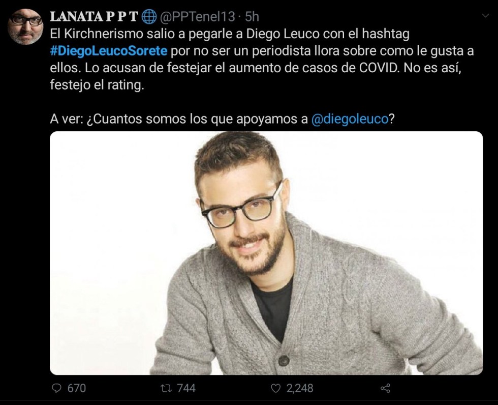 El periodista Diego Brancatelli, le escribió a Leuco en Twitter, de modo irónico, por su festejo: “Serías tan amable de contarme que te llevó a festejar con el puño apretado? No quiero imaginar que te alegra llegar a los 10 mil casos diarios…”.