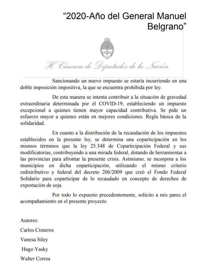 El proyecto de ley entre otras cosas señala en su artículo 1 que es un «Impuesto Único a los Bienes Personales» y que «establece por única vez un tributo a toda persona humana o las sucesiones indivisas alcanzados por el artículo 17 de la ley 23.966 – sobre los bienes existentes al 31 de marzo de 2020 que superen los diez millones de pesos. ($10.000.000)». Si bien esa suma se elevó bastante, hasta las fortunas de más de $200 millones, la inicia en esencia sigue manteniendo los ejes del proyecto original.