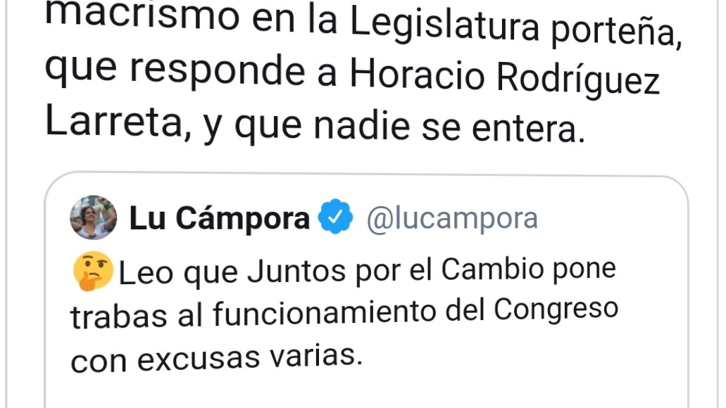 En el inicio de la publicación citada por la vicepresidenta, Cámpora sostiene que leyó que el bloque opositor «pone trabas al funcionamiento del Congreso con excusas varias». «Voy a contar cómo funcionan las cosas donde mandan ellos: en la Legislatura porteña. Porque hay que ser coherentes en la vida», remarcó.