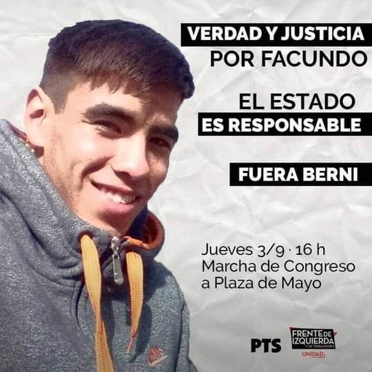 «Nos queda una nueva etapa en la lucha por justicia para Facundo y su familia, contamos con su madre que está a la cabeza de esta pelea, que se sostiene en la lucha y nos marca el camino que debemos seguir hasta lograr que los policías que cometieron su asesinato y los responsables del poder judicial paguen por las maniobras que hicieron, que el ministro de Seguridad (Sergio Berni) se vaya», reclamó.