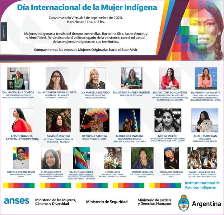 Este sábado la ministra de las Mujeres, Elizabeth Gomez Alcorta, participó del conversatorio virtual «Mujeres indígenas a través del tiempo, entre ellas Bartolina Sisa, Juana Azurduy y Aime Paine. Reinvindicando el valioso legado de la existencia con el rol actual de las mujeres indígenas en sus territorios» organizado por el Instituto Nacional de Asuntos Indígenas (INAI), del cual participaron mujeres originarias y diversas representantes.