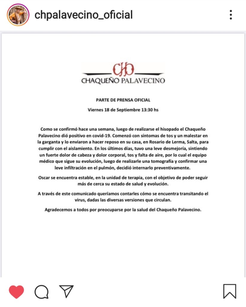 «Como se confirmó hace una semana, luego de realizarse el hisopado, el Chaqueño Palavecino dio positivo para Covid-19», expresa el comunicado difundido por @chpalavecino_oficial, que detalla que «comenzó con síntomas de tos y un malestar en la garganta y lo enviaron a hacer reposo en su casa, en Rosario de Lerma, Salta, para cumplir con el aislamiento» correspondiente. Y, acotó que «en los últimos días tuvo una leve desmejoría, sintiendo un fuerte dolor de cabeza y dolor corporal, tos y falta de aire».