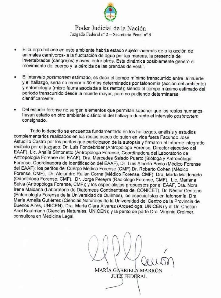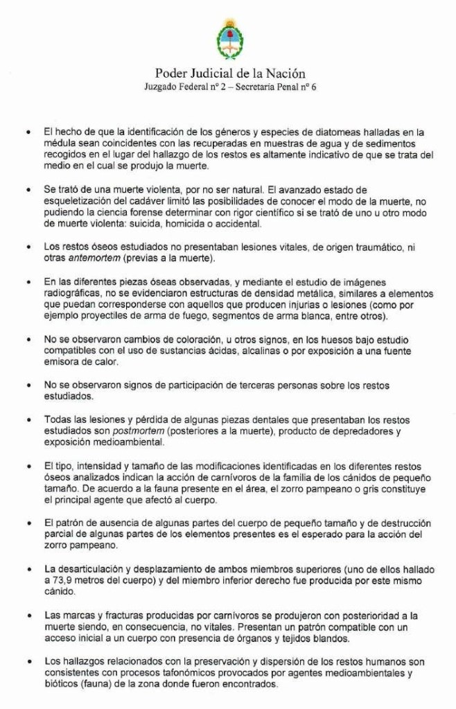 «Se trató de una muerte violenta, por no ser natural. El avanzado estado de esqueletización del cadáver limitó las posibilidades de conocer el modo de la muerte, no pudiendo la ciencia forense determinar con rigor científico si se trató de uno u otro modo de muerte violenta: suicida, homicida o accidental», detalla el informe, según un comunicado de prensa emitido por el juzgado federal 2 de Bahia Blanca, a cargo de la causa.