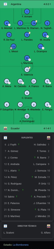 El seleccionado argentino jugó ante el de Ecuador, en un partido que arrancó poco después de las 21.30 en la cancha de Boca Juniors, por la primera fecha de las eliminatorias sudamericanas rumbo al Mundial de Qatar 2022, con el arbitraje del chileno Roberto Tobar y las siguientes alineaciones: