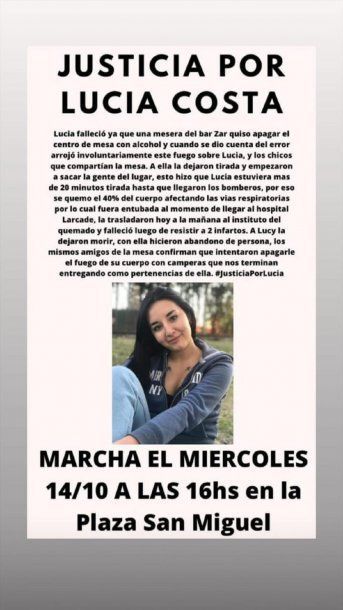 El hecho tuvo lugar el pasado viernes 9 de octubre en Zar Burgers, ubicado en la calle Paunero 1189, de San Miguel, donde luego de ser salpicada por alcohol encendido durante la recarga imprudente de un hornito que pretendía calefaccionar el bar, Lucía murió producto de las quemaduras y ocho de sus amigos resultaron con heridas de diferente consideración.