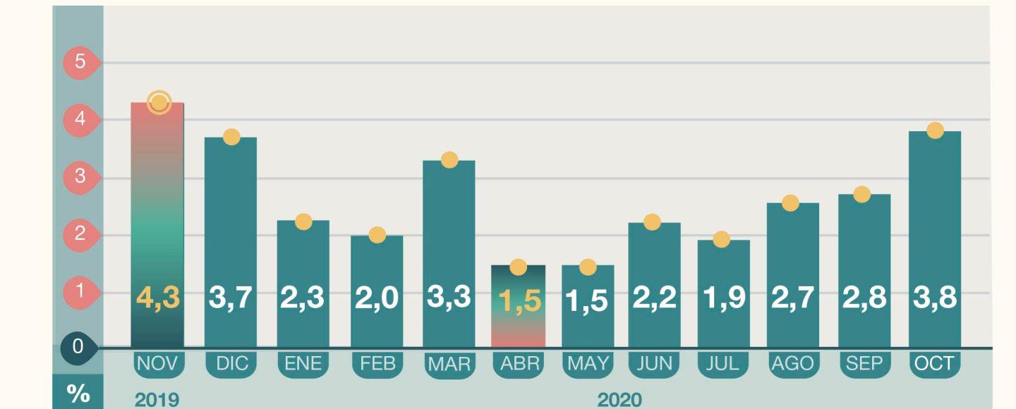 En base al informe del Indec, la suba registrada a lo largo de los primeros diez meses del año -de 26,9%- se ubica 15,3 puntos porcentuales por debajo del 42,2% de igual lapso de 2019.