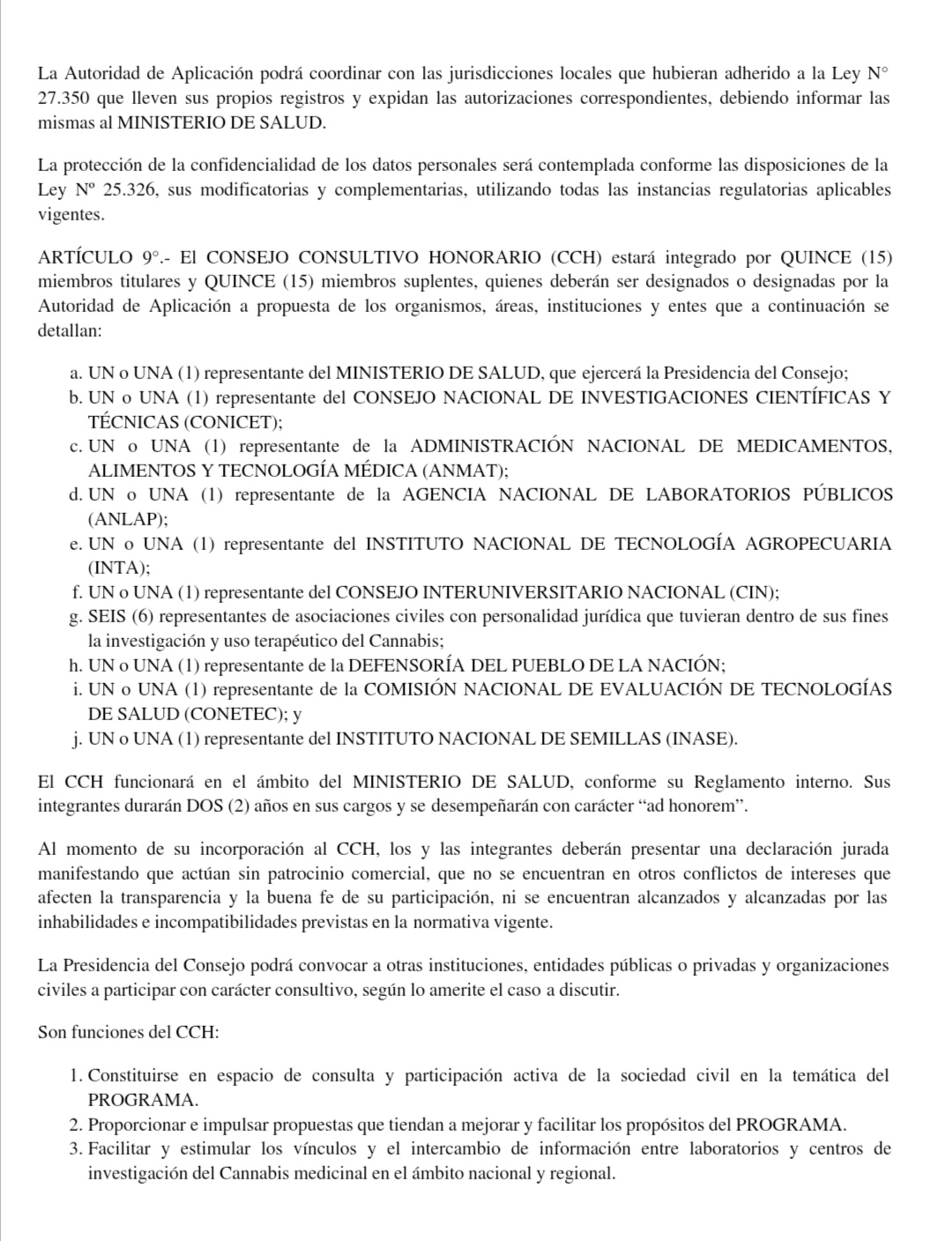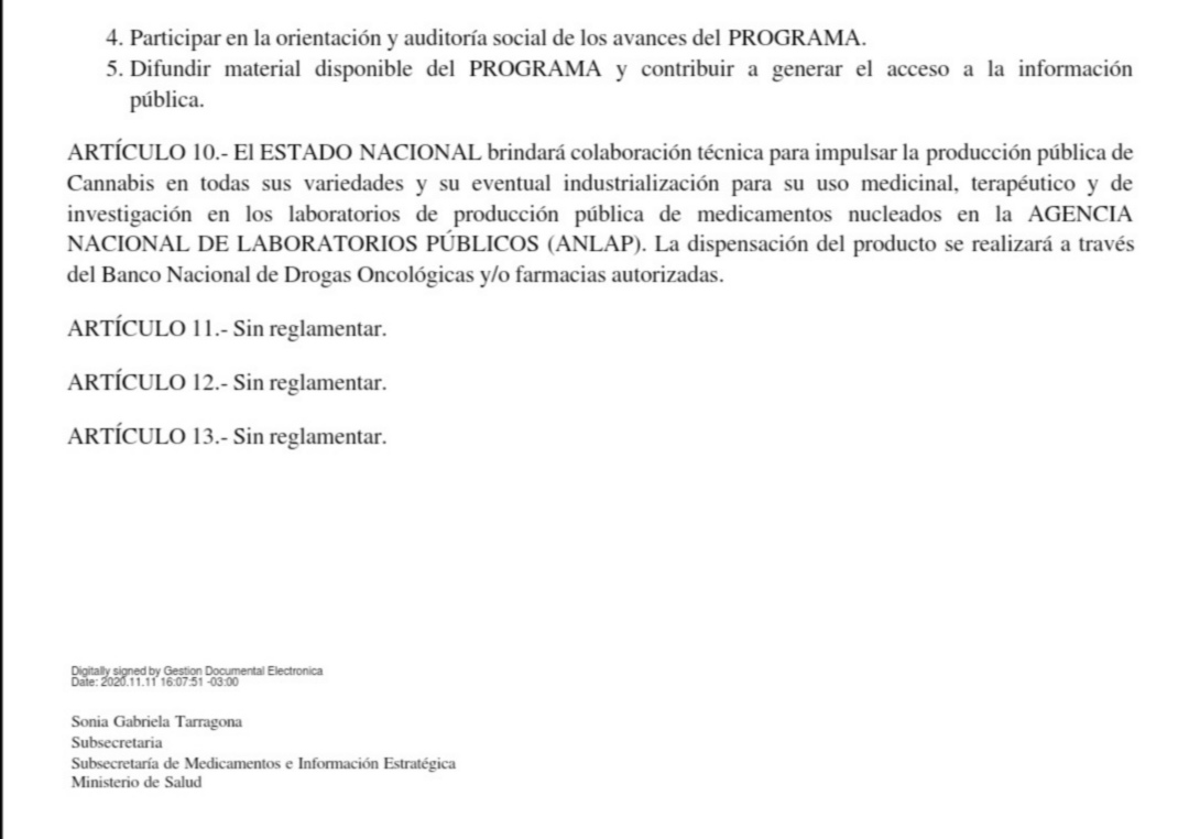 También, apunta al «desarrollo de guías de asistencia, tratamiento y accesibilidad; la provisión en forma gratuita por parte del Estado de derivados de la planta para pacientes que cuenten con indicación médica y con cobertura pública exclusiva, y el impulso de investigaciones relacionadas con los fines terapéuticos y científicos de la planta de cannabis y sus derivados».