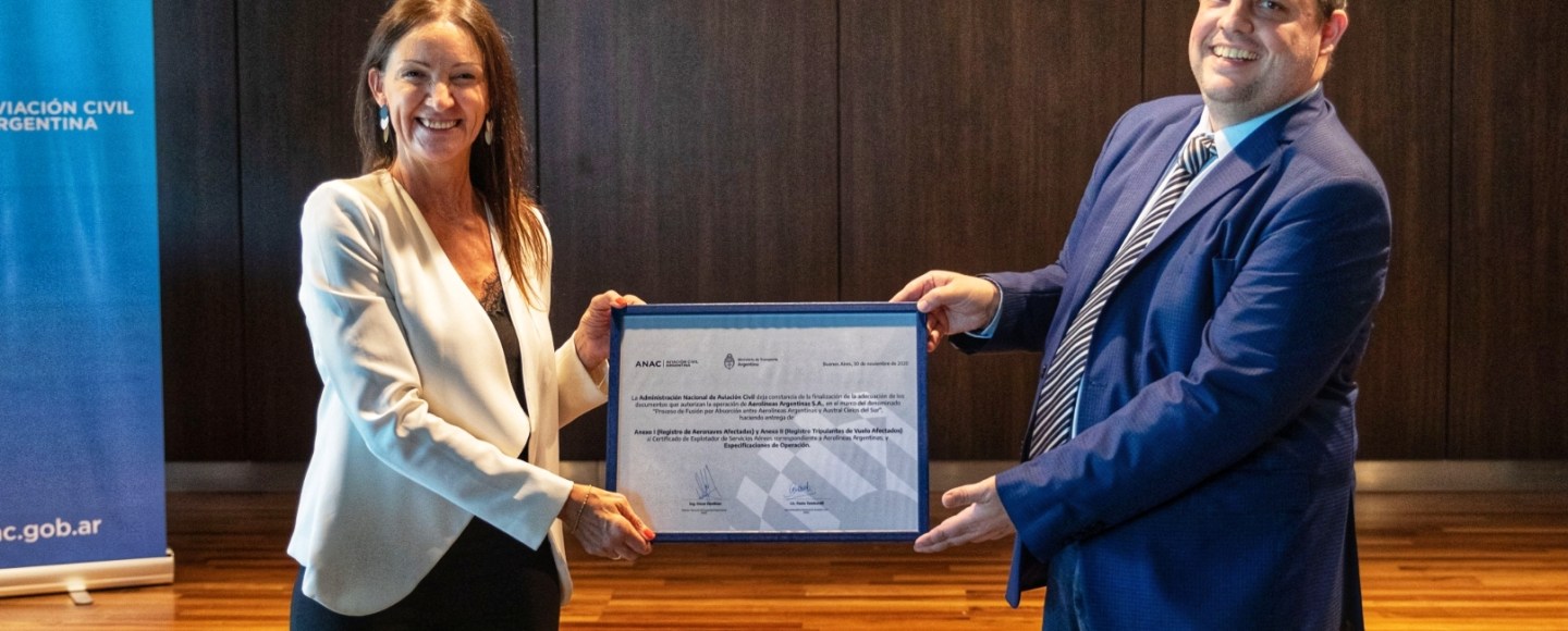 El documento que certifica la unión de ambas compañías fue entregado por Paola Tamburelli, la titular de la ANAC, al titular del Grupo Aerolìneas Argentinas, con lo que se completa el proceso iniciado en mayo y que tiene características históricas, debido a que hasta el momento gran parte de sus operaciones estaban duplicadas e, incluso, con diferentes regímenes laborales.