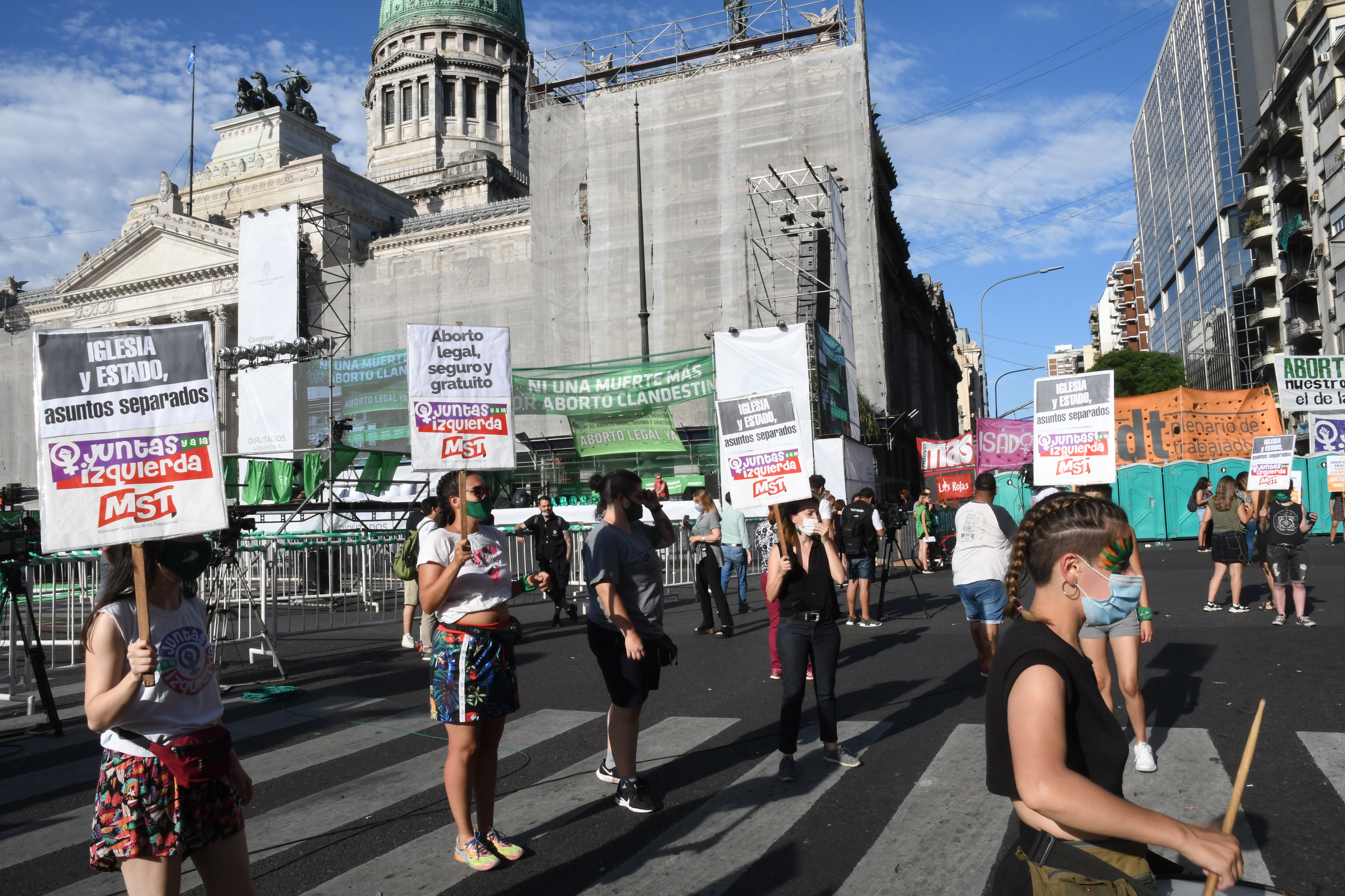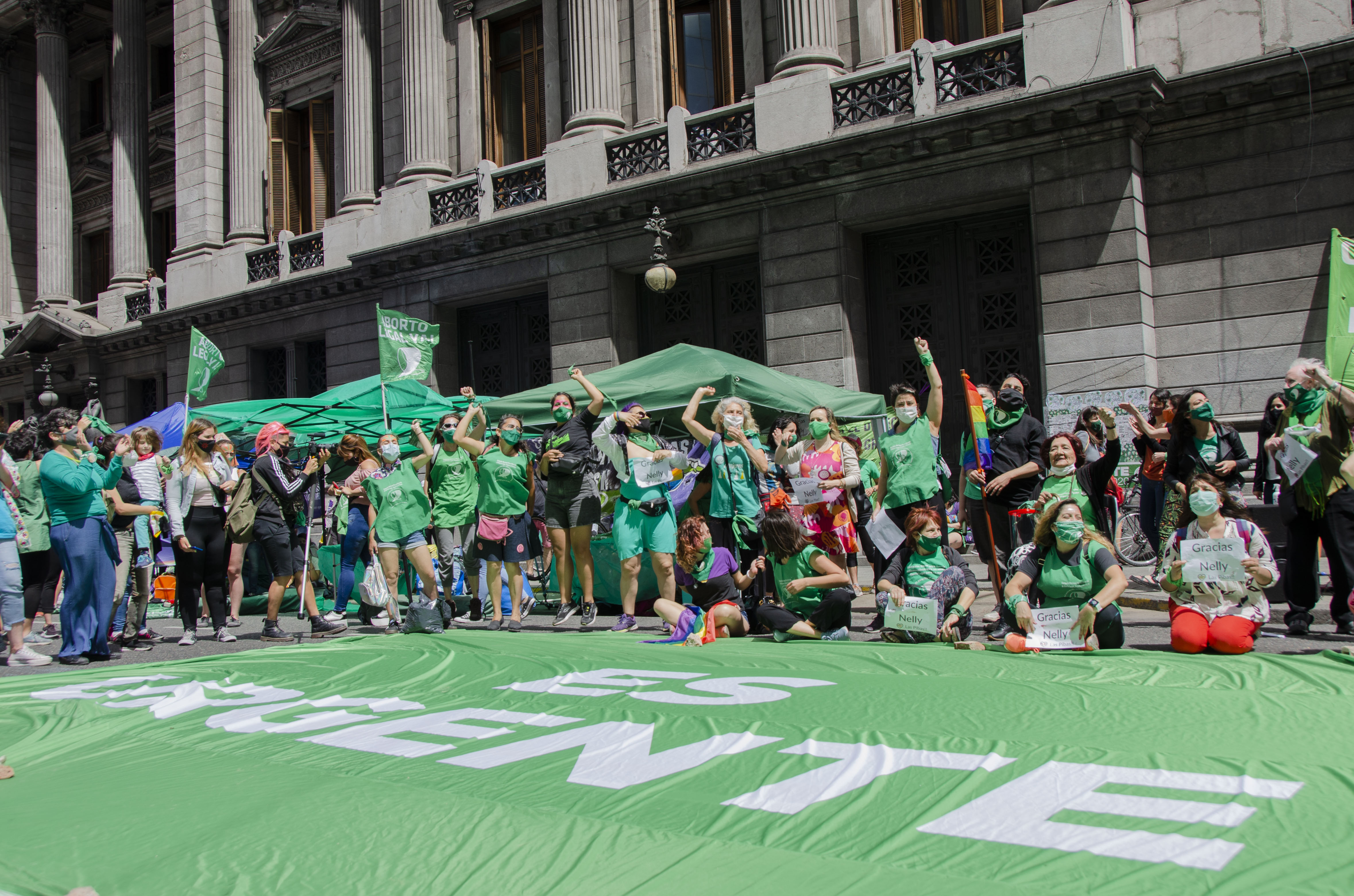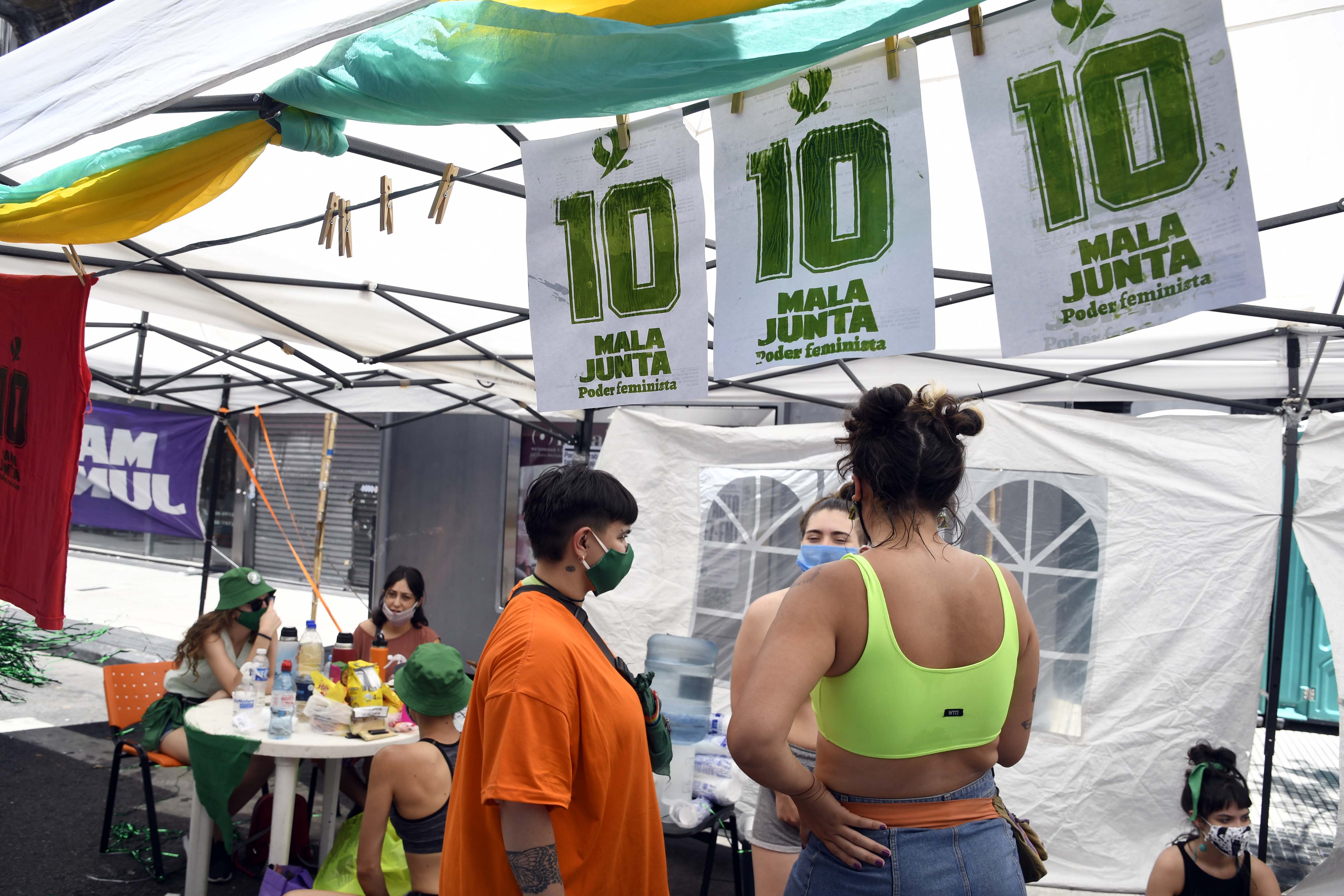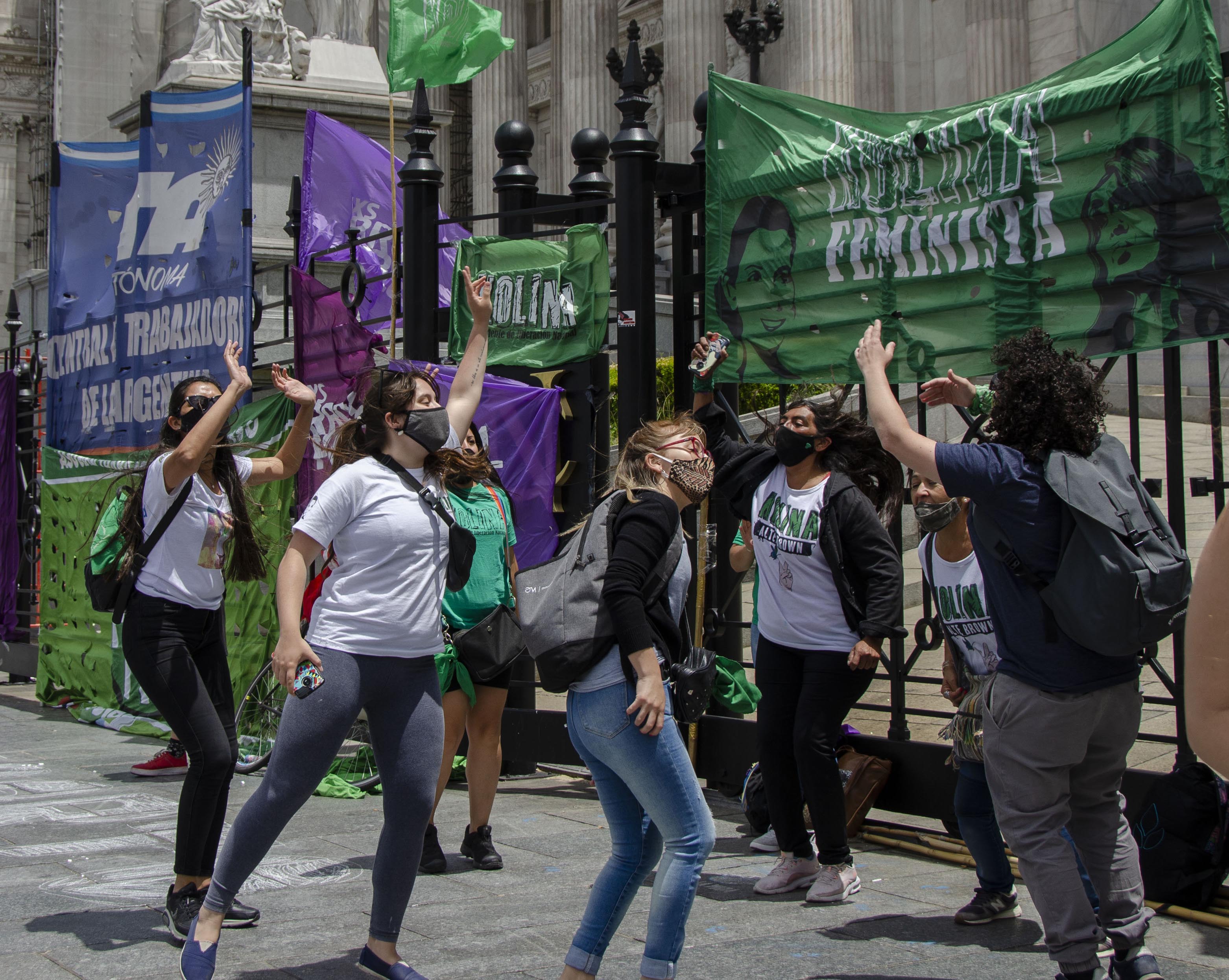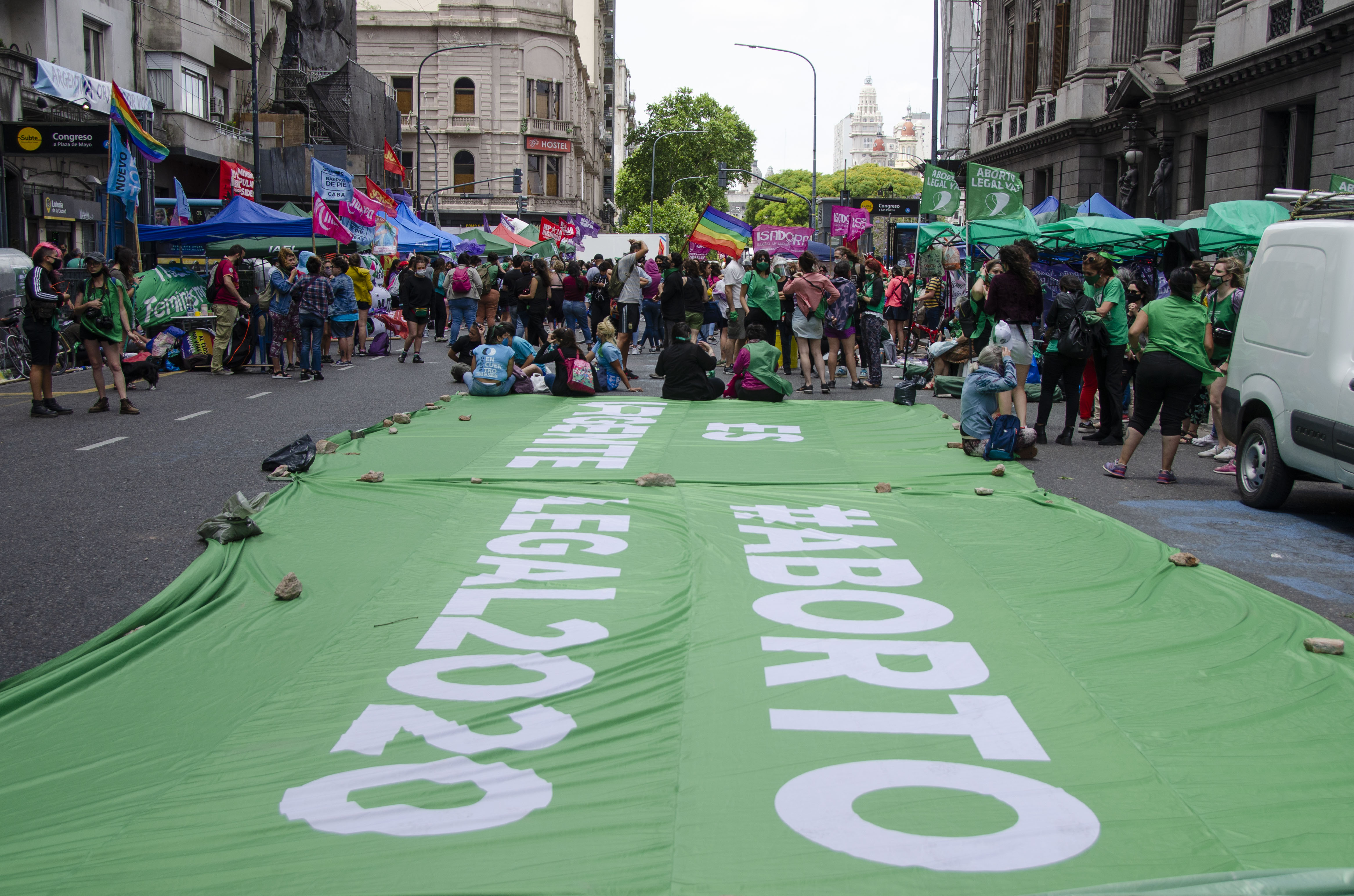 Integrantes de distintas organizaciones feministas, gremios y partidos políticos colmabanel sector «verde» dispuesto en las inmediaciones del Congreso Nacional donde los diputados iniciaron el debate del proyecto de ley de Interrupción Voluntaria del Embarazo (IVE) y el Plan de los 1000 días para la protección integral a la persona gestante y el niño hasta los primeros tres años de vida.