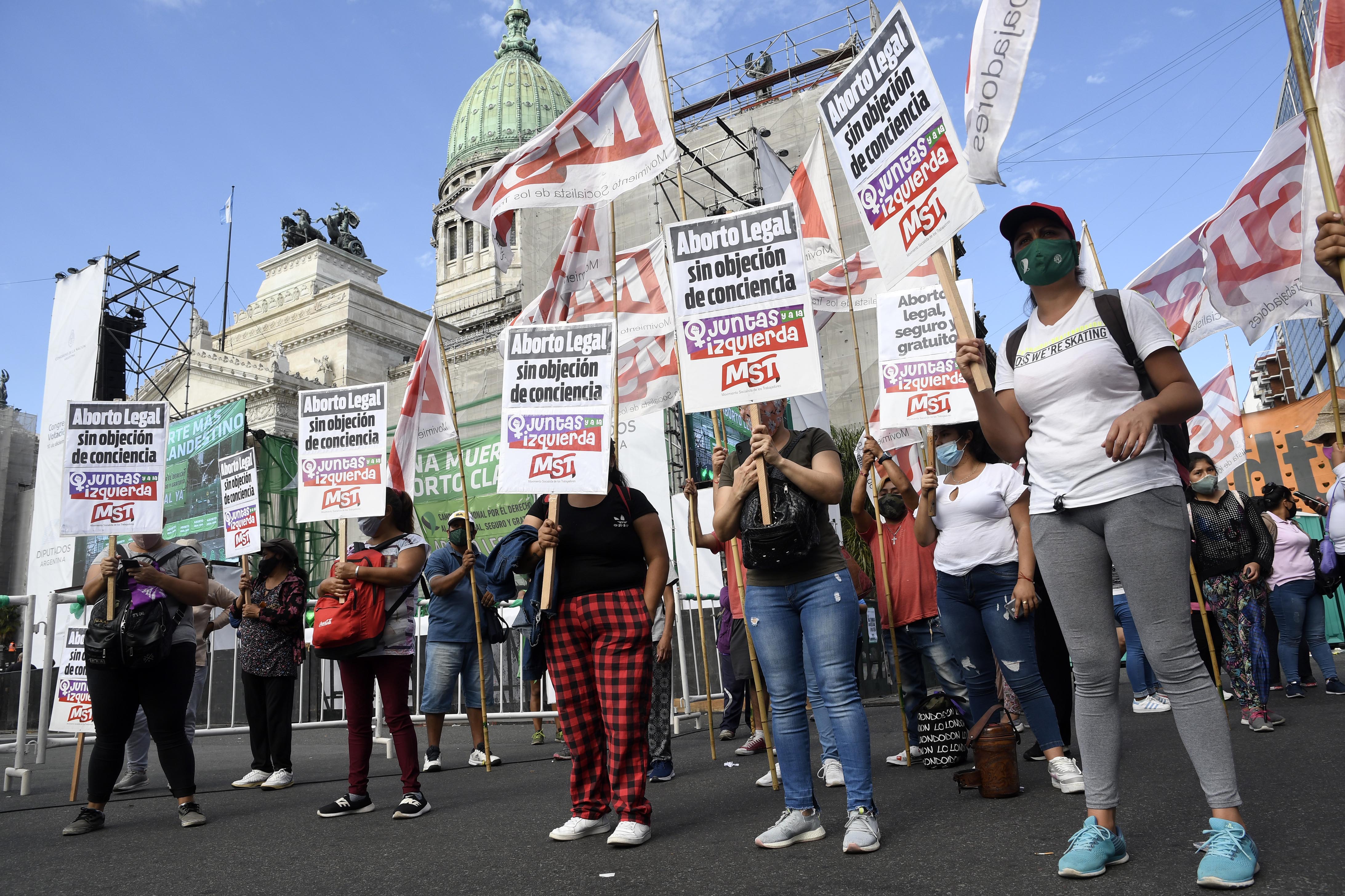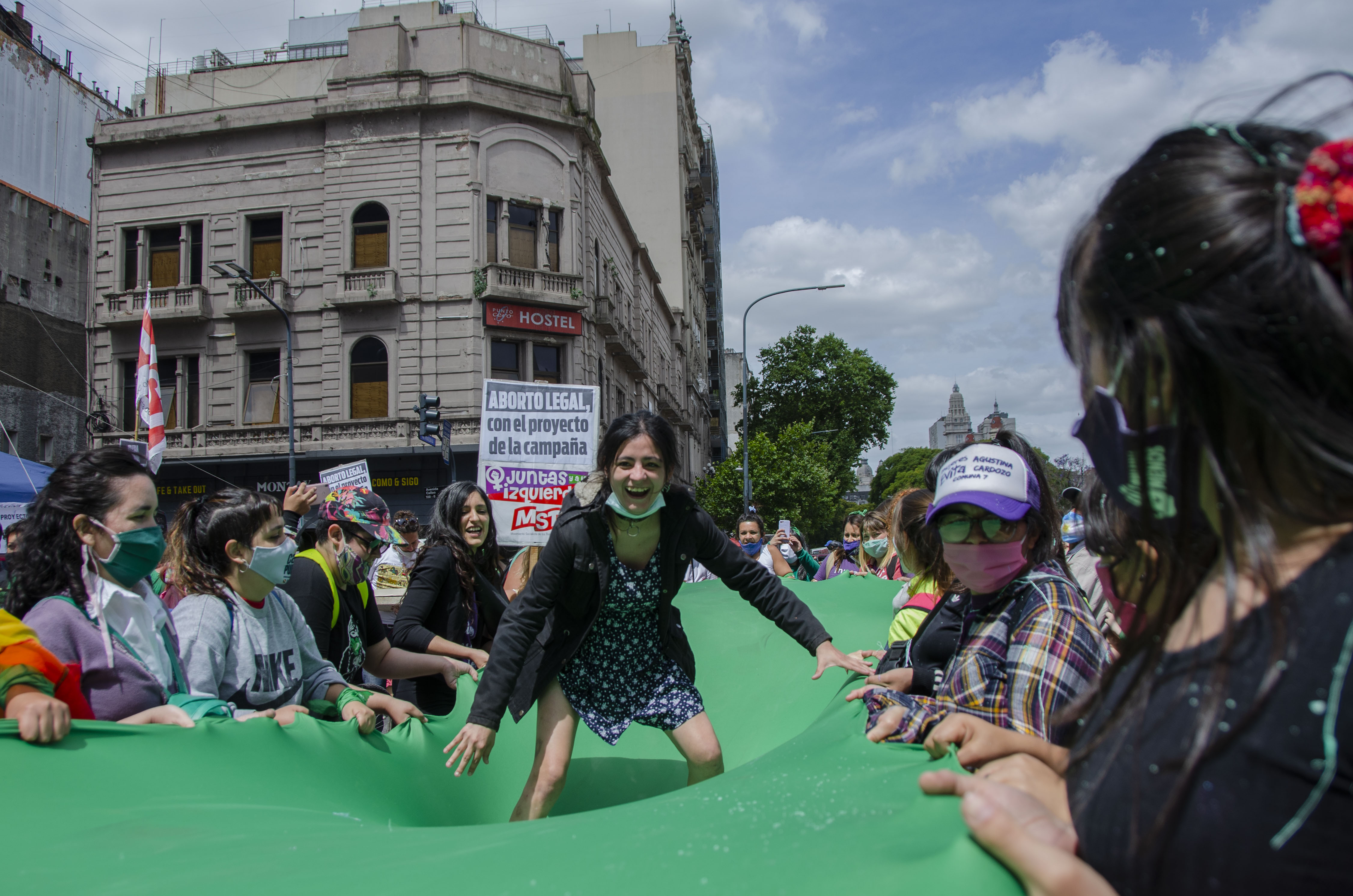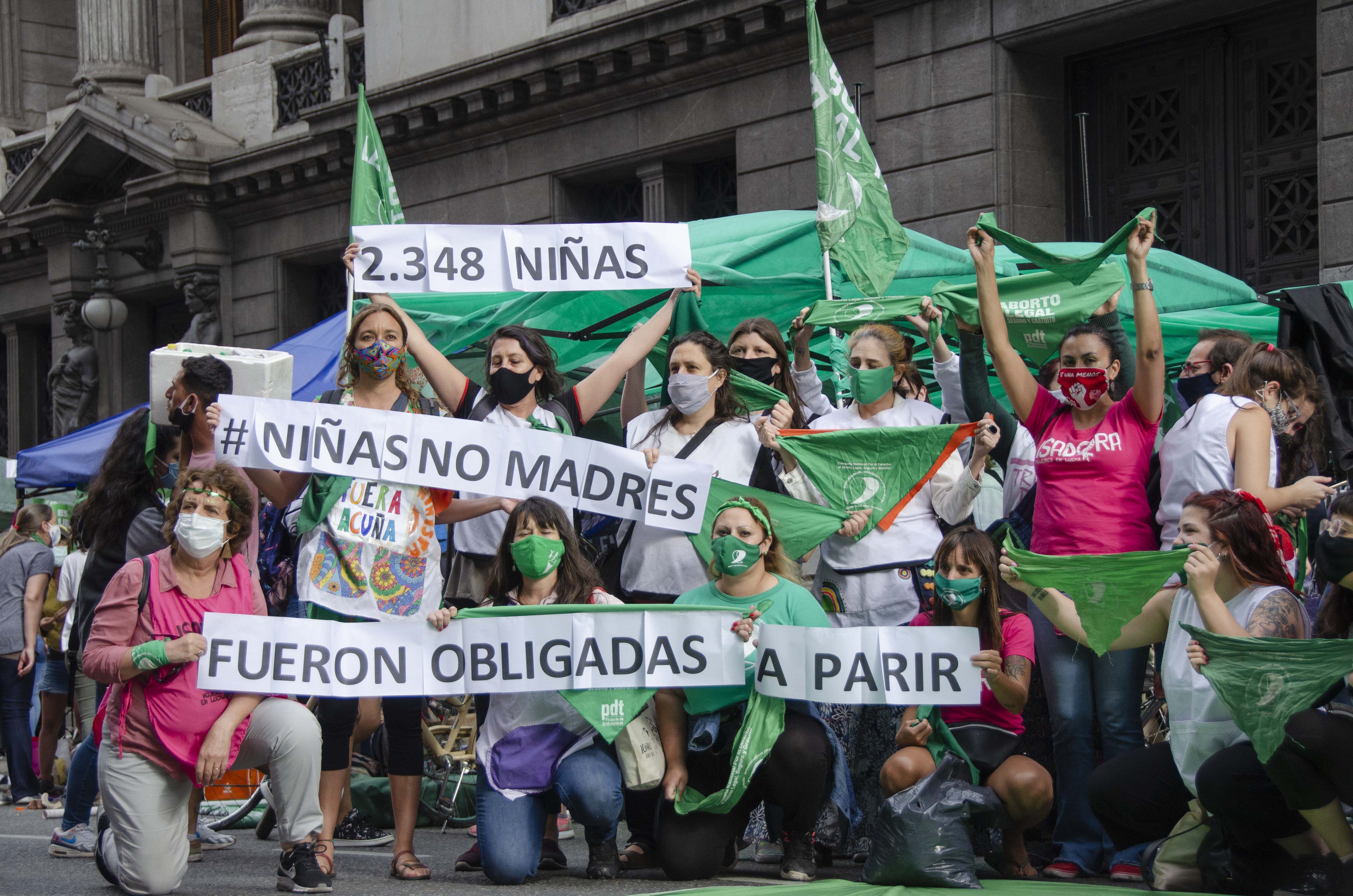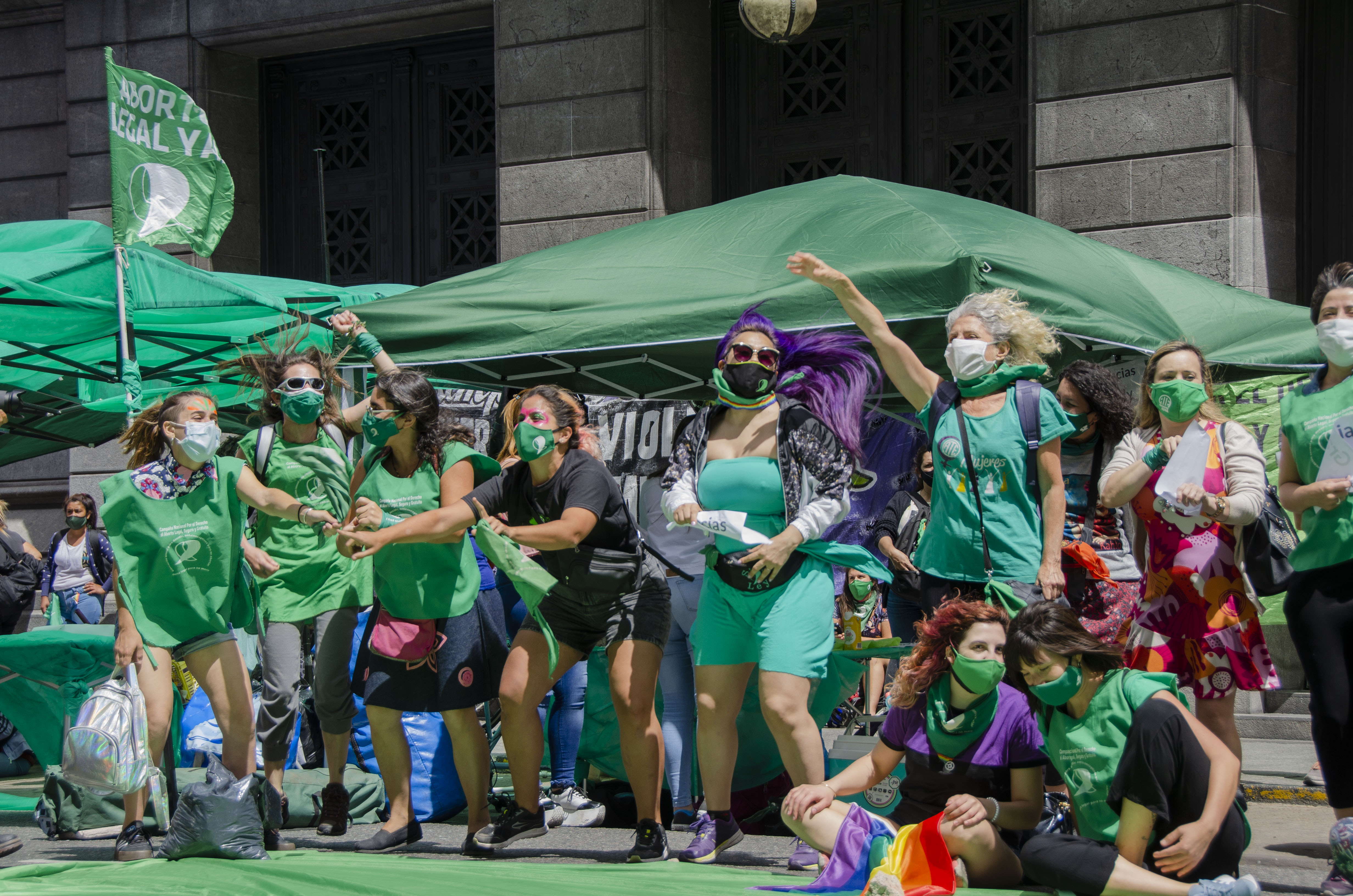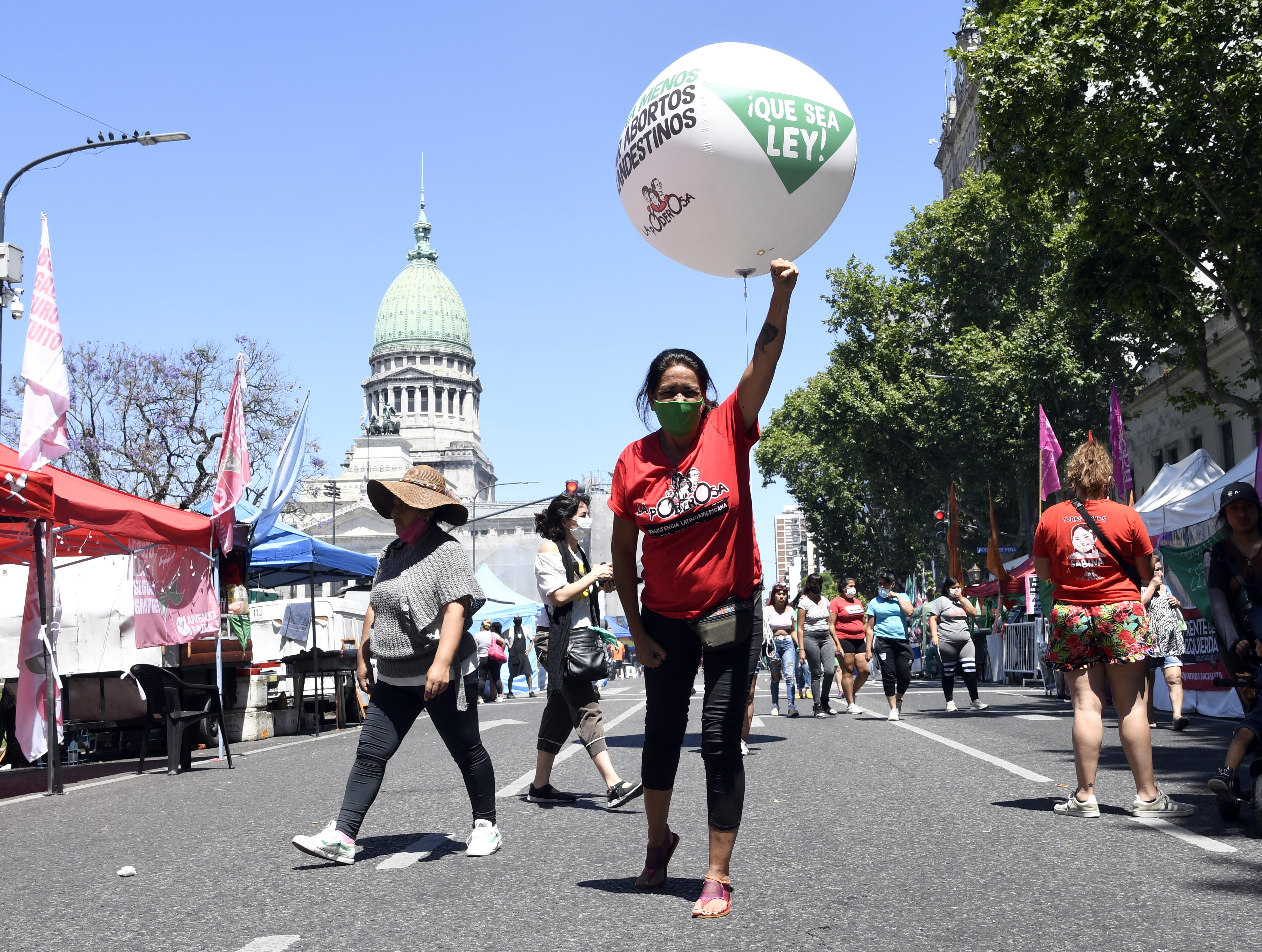 Integrantes de distintas organizaciones feministas, gremios y partidos políticos colmabanel sector «verde» dispuesto en las inmediaciones del Congreso Nacional donde los diputados iniciaron el debate del proyecto de ley de Interrupción Voluntaria del Embarazo (IVE) y el Plan de los 1000 días para la protección integral a la persona gestante y el niño hasta los primeros tres años de vida.