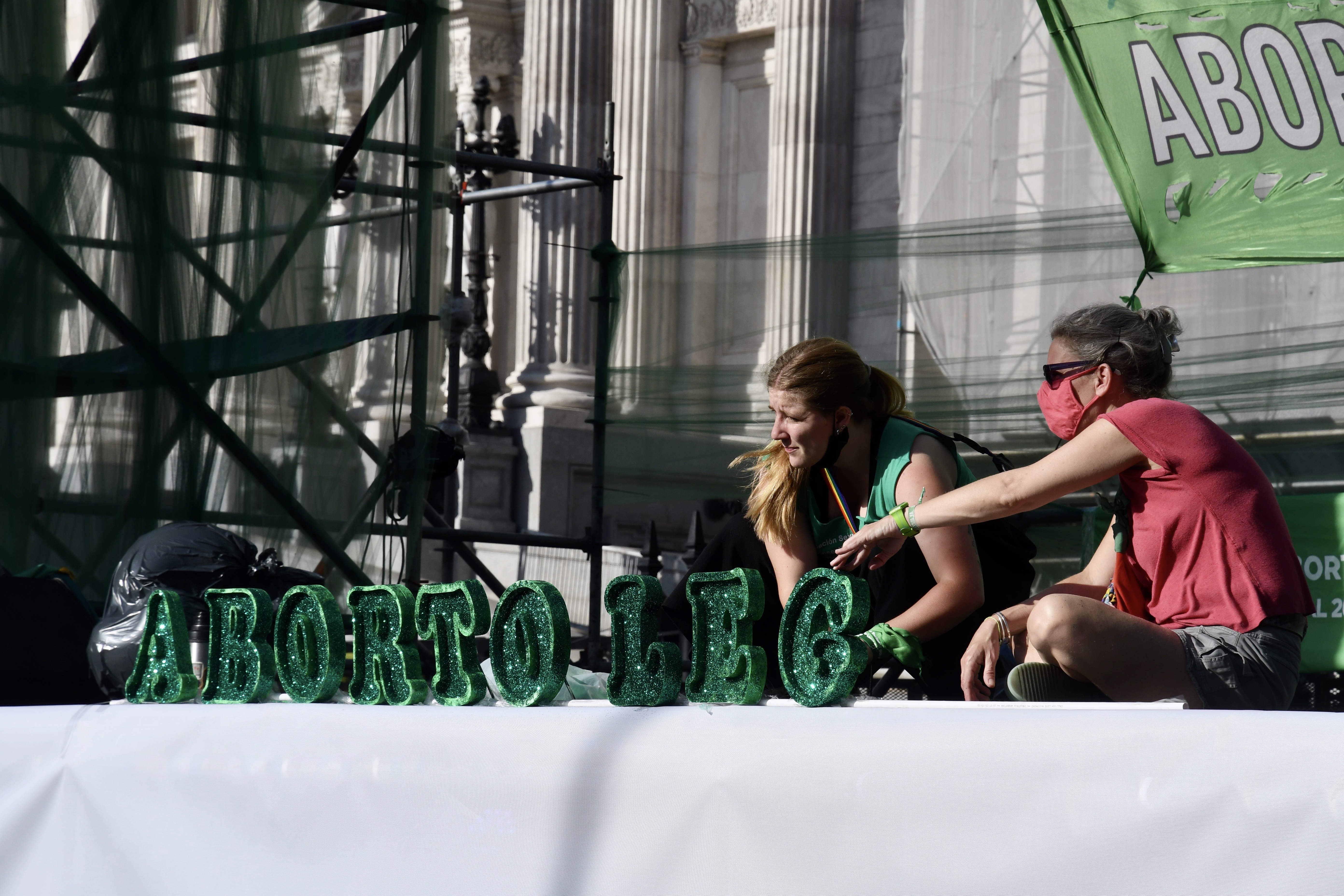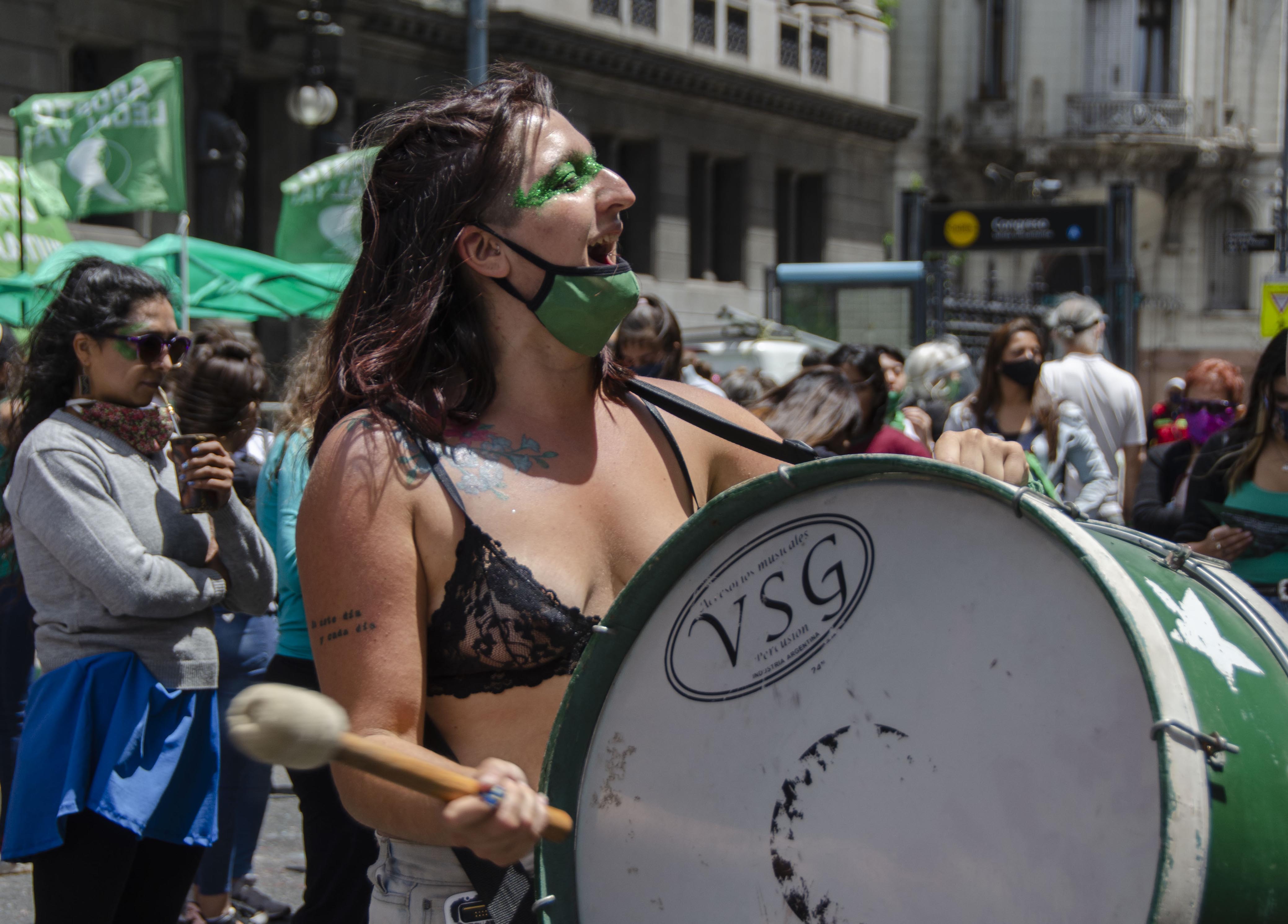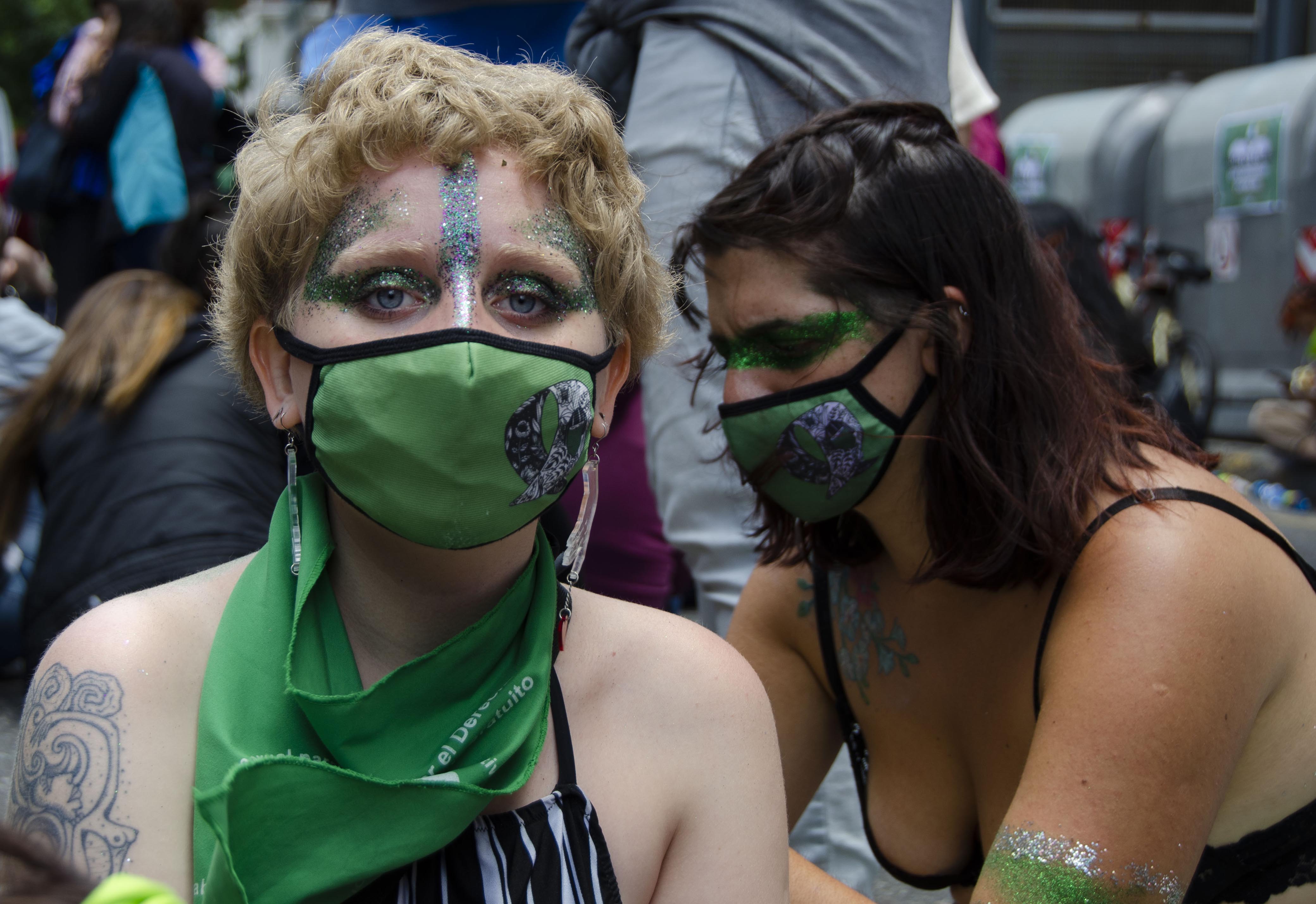 Las integrantes de las agrupaciones llegaron con bombos y redoblantes y grupos de jóvenes independientes acompañaban la jornada pintándose los rostros con glitter y pintura verde a la espera de la votación que se prevé será durante la madrugada del viernes.