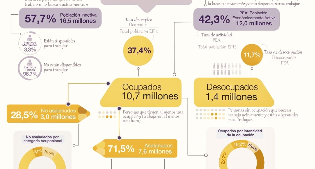 En lo que respecta al informe dado a conocer hoy, la dependencia oficial señaló que si bien la tasa de empleo (TE) –la proporción de personas ocupadas con relación a la población total- subió 4 puntos porcentuales con respecto al trimestre anterior, para alcanzar al 37,4%, en el cotejo interanual se verificó una baja de 5,2 puntos porcentuales.