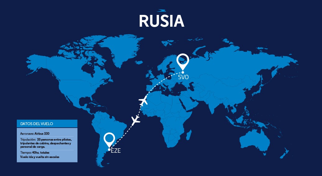 Explicó que “el vuelo AR1060 será directo a Moscú y contará con una tripulación de 20 personas para poder realizar la operación de 40 horas totales sin realizar descanso en el destino». «La tripulación «estará integrada por pilotos, tripulantes de cabina, despachantes y personal de carga”, añadió.