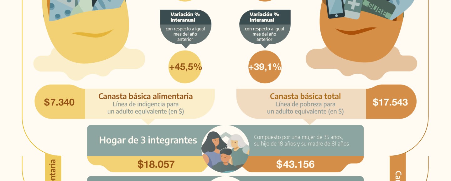 Por su parte, el costo de la Canasta Básica Total (CBT), que además de alimentos reúne indumentaria y transporte, marcó un incrementó 4,7 % en diciembre, por lo cual el mismo grupo familiar necesitó contar con ingresos por $54.207,53 para no caer debajo de la línea de la pobreza, mientras que el acumulado del año cerró con un aumento de 39,1%.