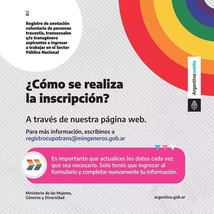 La ministra de las Mujeres, Géneros y Diversidad, Elizabeth Gómez Alcorta, puso en marcha esta miércoles el Registro de Anotación Voluntaria de Personas Travestis, Transexuales y Transgénero aspirantes a ingresar al sector público nacional para desempeñarse en diferentes cargos laborales. «Es un paso más» en «el recorrido y lucha» de este colectivo sostuvo la funcionaria.