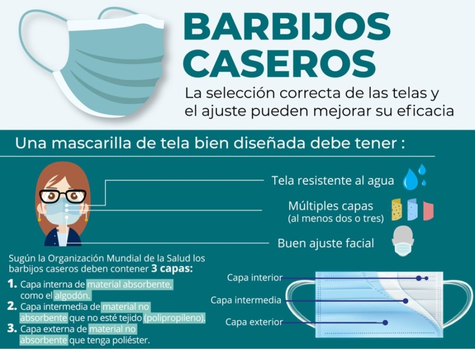 Según la Organización Mundial de la Salud, los barbijos caseros deben contener tres capas: una capa interna de material absorbente, como el algodón; una capa intermedia de material no absorbente y que no esté tejido, como el polipropileno, y una capa exterior de material no absorbente, como el poliéster o una mezcla que contenga poliéster.