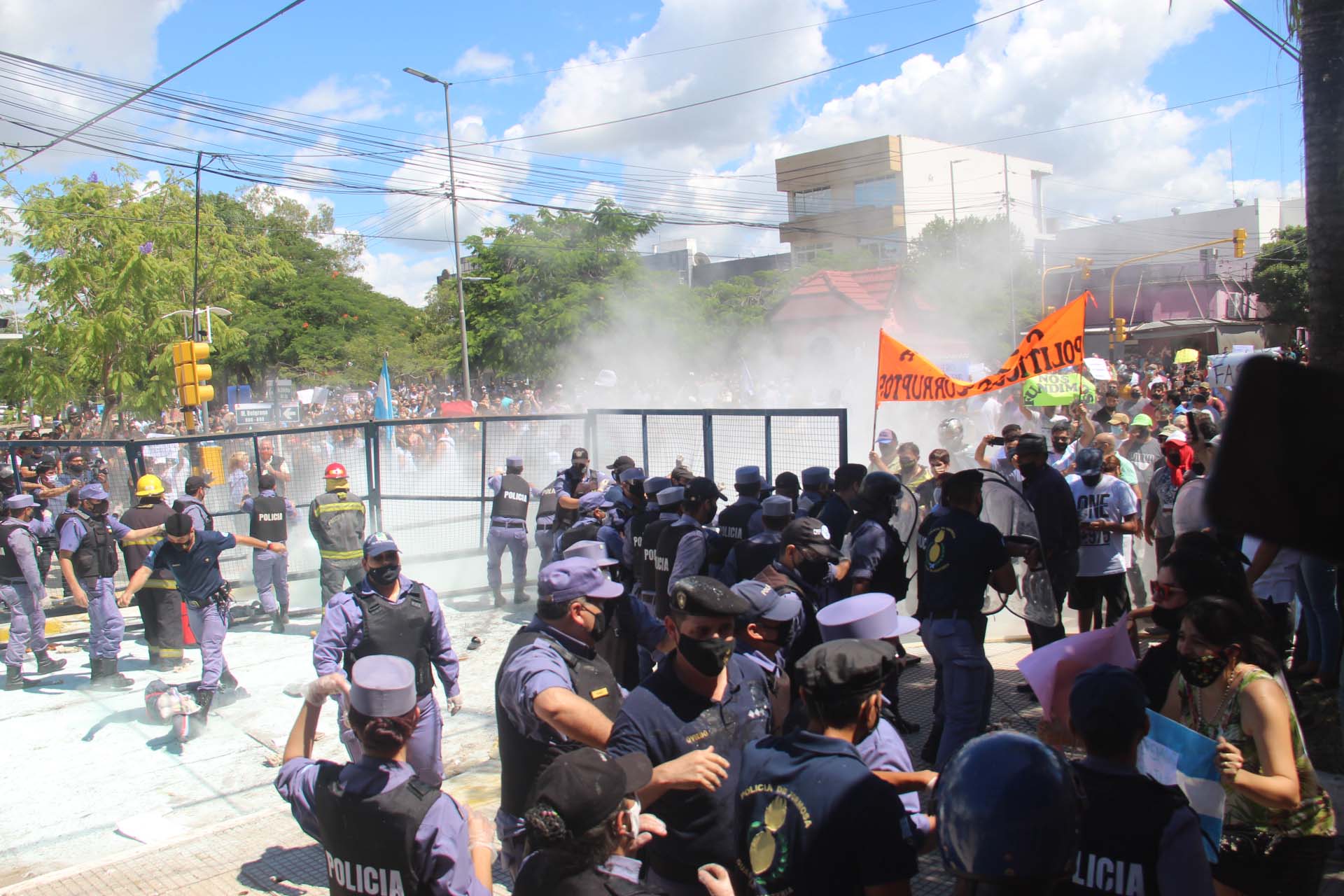 La manifestación comenzó este viernes por la mañana con la convocatoria de distintos sectores provinciales en rechazo de la decisión del gobernador Gildo Insfrán a volver a la fase 1, y al poco tiempo derivó en choques entre quienes protestaban y la policía.